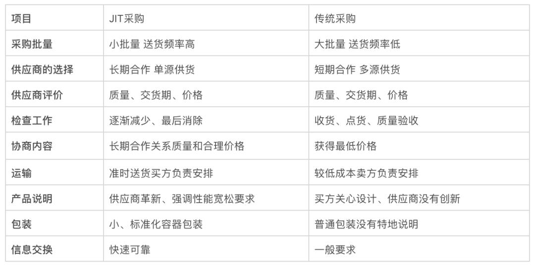 JIT(Just in Time)采购也叫准时化采购,需求方根据自己的需要,对供应商下达供货指令,要求供应商在指定的时间、将指定的品种、指定的数量送到指定的地点。