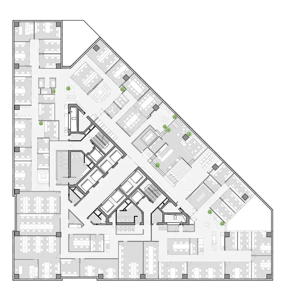 对内空间中将开放办公区桌椅组合围绕窗户进行布置,为办公人群提供更开阔的视野与更良好的光线。