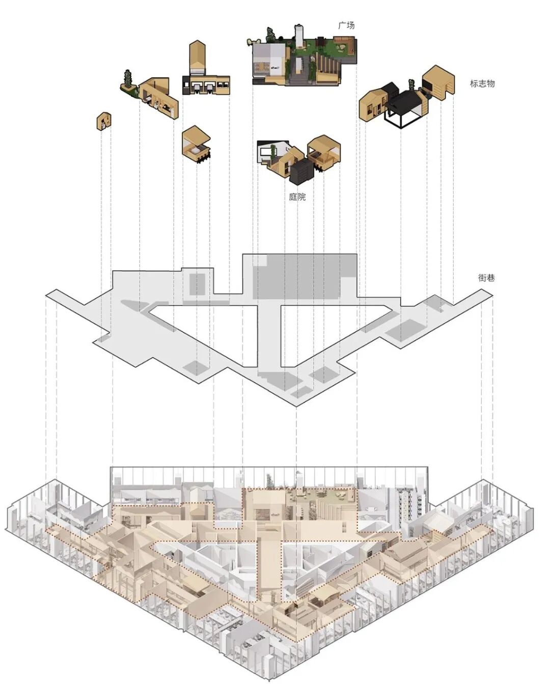 通过切割功能区域重塑城市中的街区与巷道,并在巷子内提供丰富的交流环境,希望可以帮助空间中的人们在巷子里偶遇、相聚,并鼓励他们用更有人情味的面对面交谈代替缺乏温度的数字信息传递。