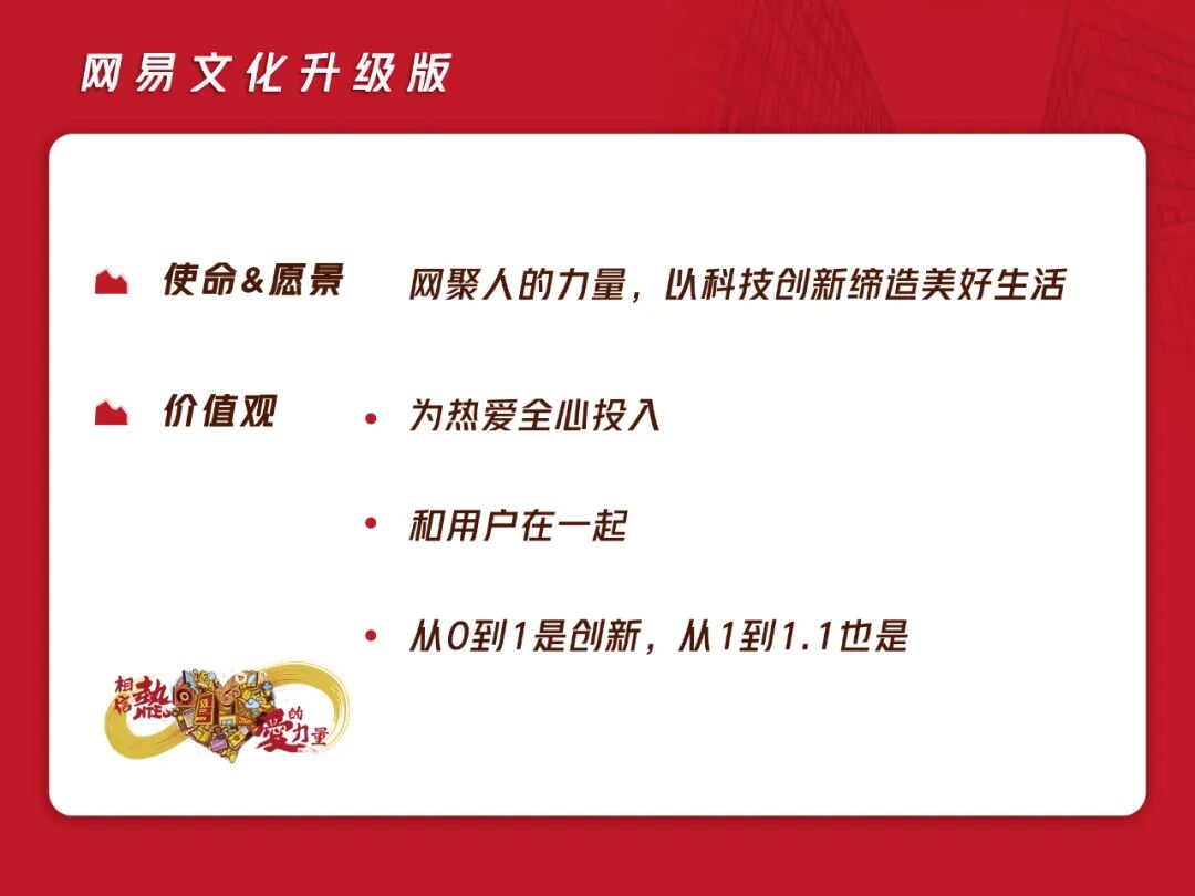 网易刚成立时,我们只有热爱,连企业文化是什么都不知道。甚至还被很多人质疑,你们干嘛要做一家互联网公司,这怎么挣钱?但当你一不小心把公司做了23年,公司发展到2万多人的规模,你会回去思考和总结一些观点出来。