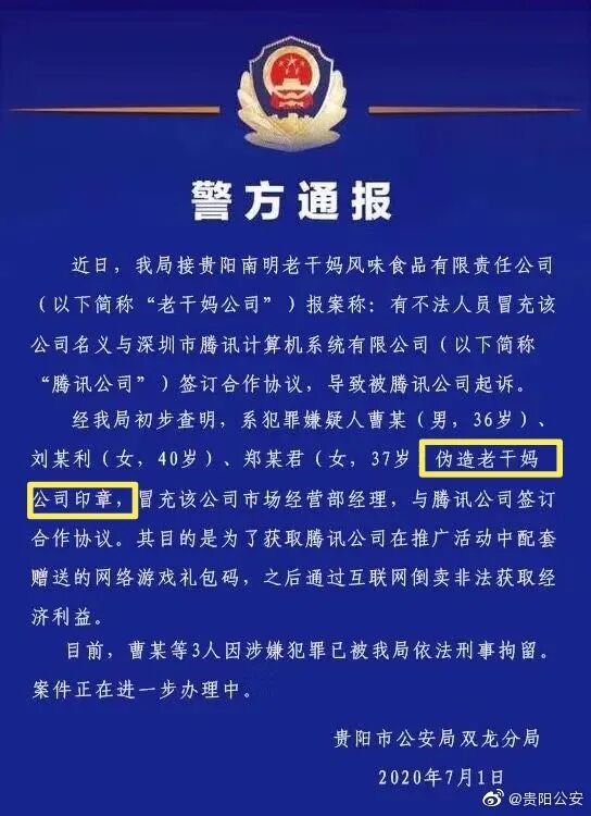 从目前的警方通报来看,这3人伪造老干妈印章跟腾讯签了合同。