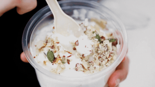 酸奶是那种传统的老味道,坚果被单独分装在小盒里,想吃了再撒上,拌均匀之后入口,香甜爽脆。