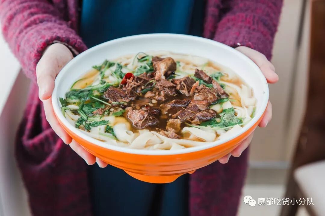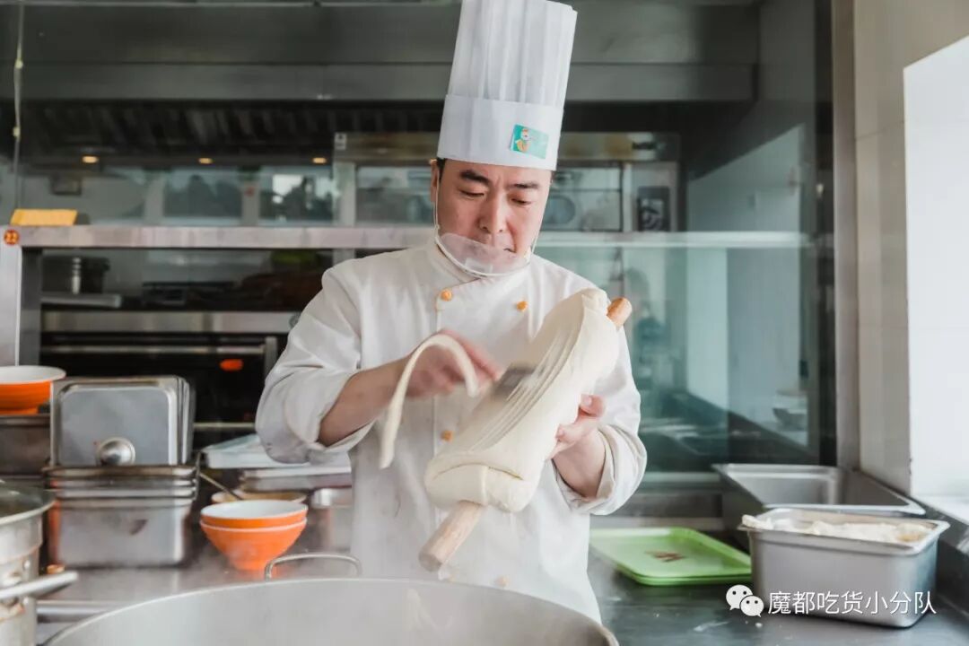 师傅现场揉面,将发酵好的面卷在擀面杖上制作刀削面,翻腾的面片从空中飞入沸水中,没几分钟就捞出锅,然后传递到另一个师傅手上舀入熬制过的汤水。
