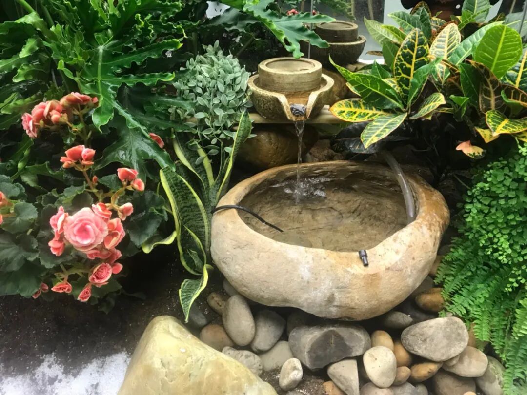 推荐组合:绿萝、睡莲等小型植物;龟背竹、散尾葵、虎尾兰等中型植物;流水、石头等装饰