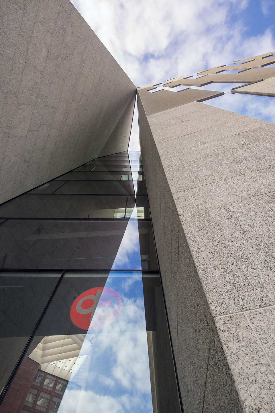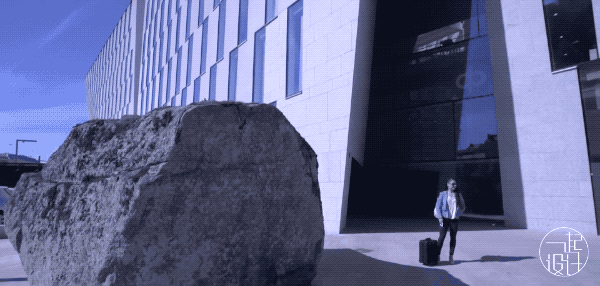 另外,折线立面也让大楼在阳光照射下显现出不同的阴影效果,有着持久、永恒的内涵 ▼在入口处还摆放了两块真实的巨大石头,将入口围绕起来 ▼