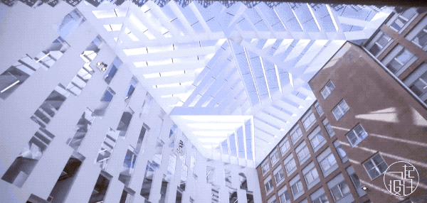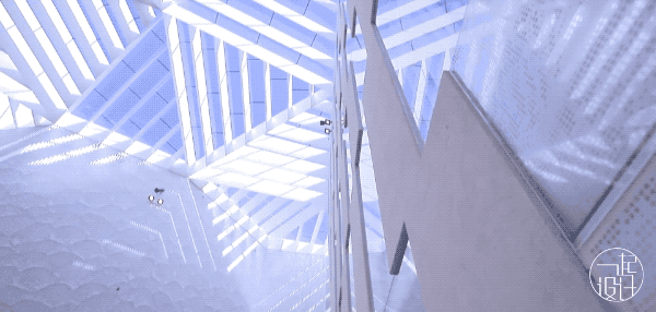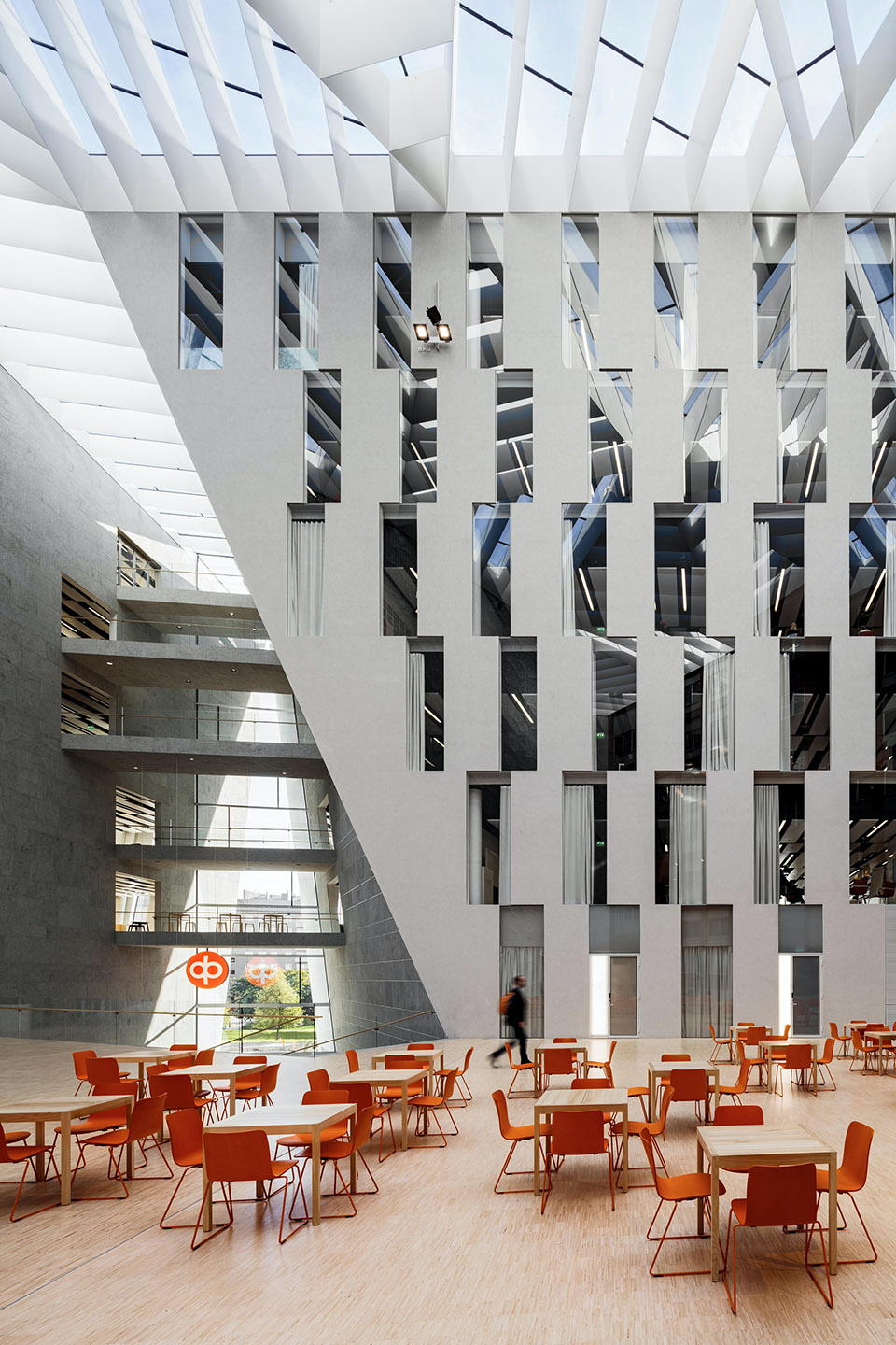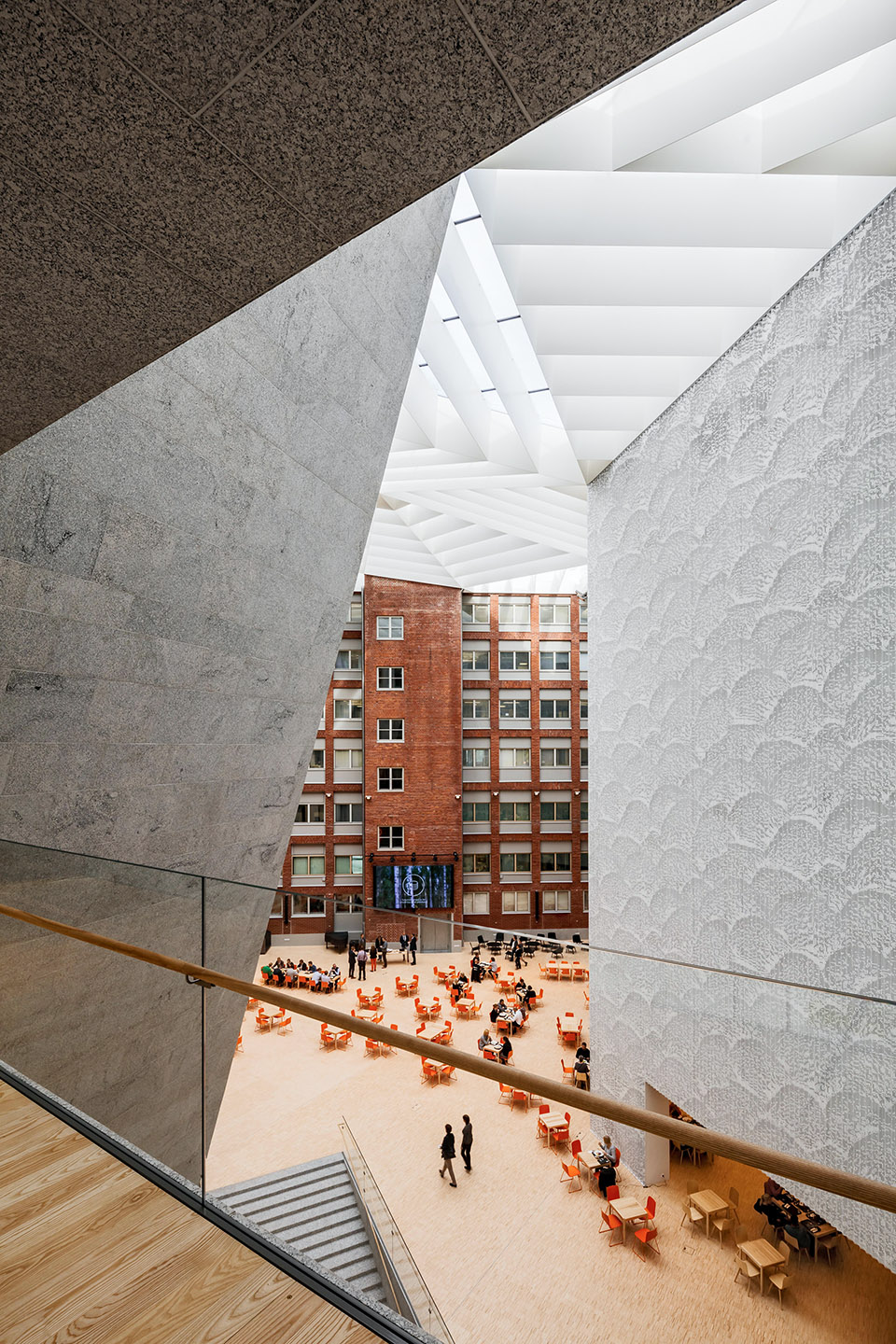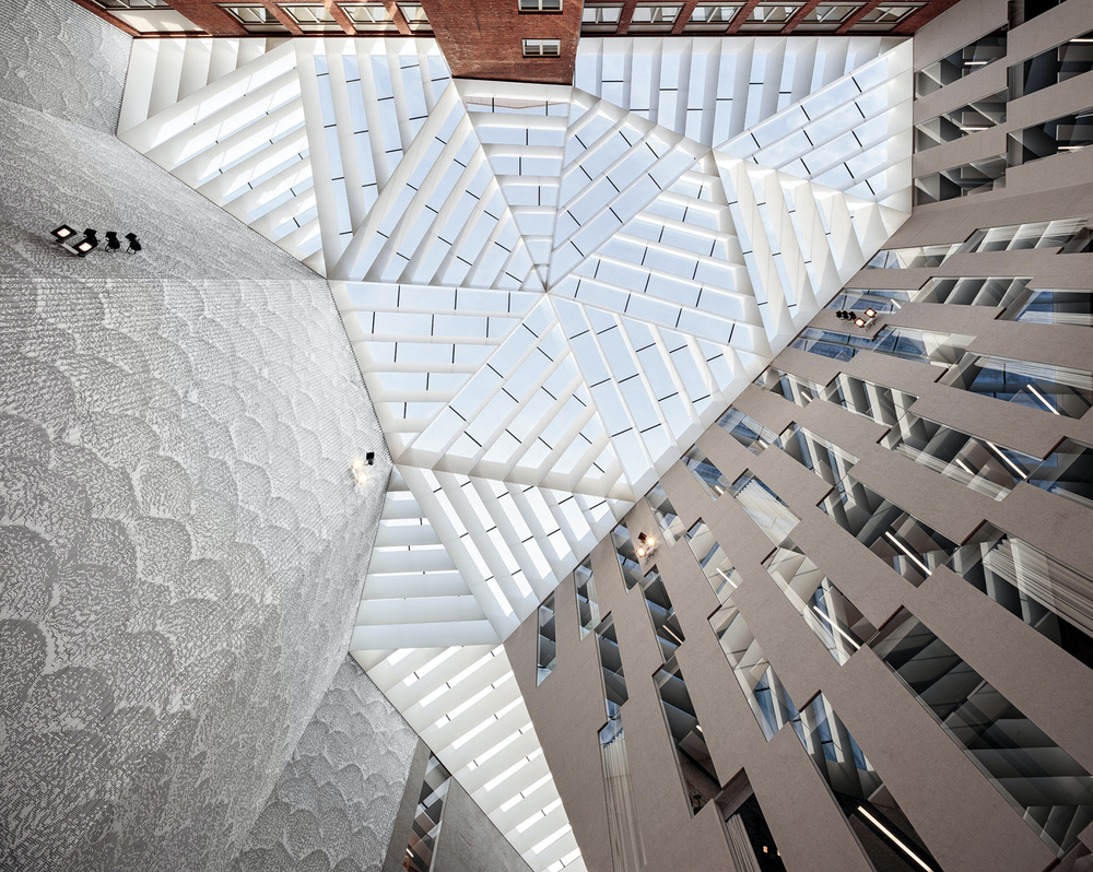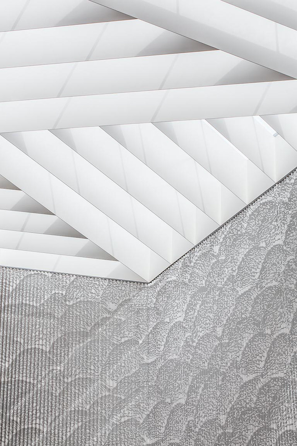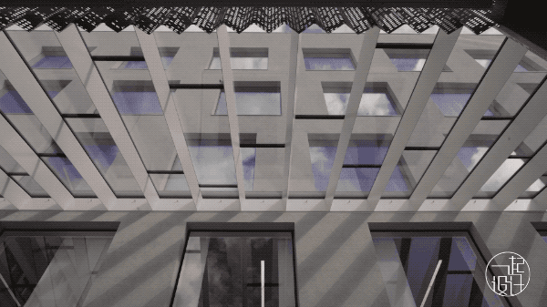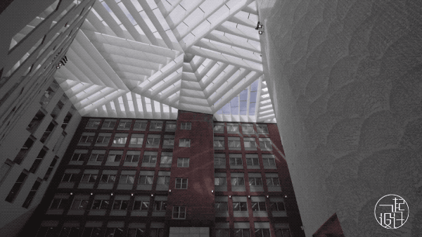 明亮的空间氛围、极为巨大的空间尺度、各种充艺术感的折线以及墙面的材质肌理,无一不在透露出独特的美感 ▼石材、金属穿孔板、玻璃、红砖……这些各自都非常独特的材质同时出现在一个画面中,却分外和谐而美好 ▼整栋大楼最吸睛的地方肯定就是下面这个采用了独特钢结构的玻璃屋顶 ▼得益于它,整个室内空间不仅氛围明亮,而且巨大的体量显得尤其轻盈,让人在室内都能感受到如同在室外行走般的通畅 ▼而室内的建筑内立面延续了外立面的开窗逻辑,有一种独特的秩序美感,玻璃窗户倒映出玻璃天窗的景象 ▼玻璃天窗有着独特的几何结构,仰视的景象还能看到各种丰富的内墙面肌理,彼此互相碰撞、消融 ▼玻璃屋顶以及内墙的纹理细节构成了一幅优美的图画 ▼在这里可以看到墙面采用了弯折起伏的穿孔板作为装饰,与其他室内空间形成虚实结合 ▼室内有着通往区域内部的长廊,设计得非常开放而且有吸引力,联通了各个功能空间 ▼