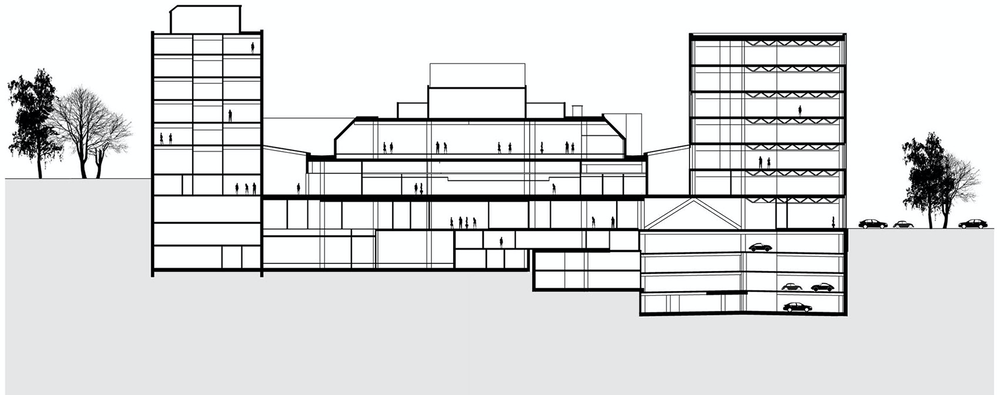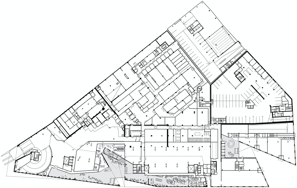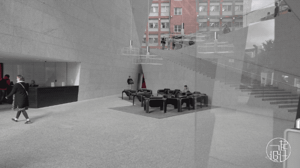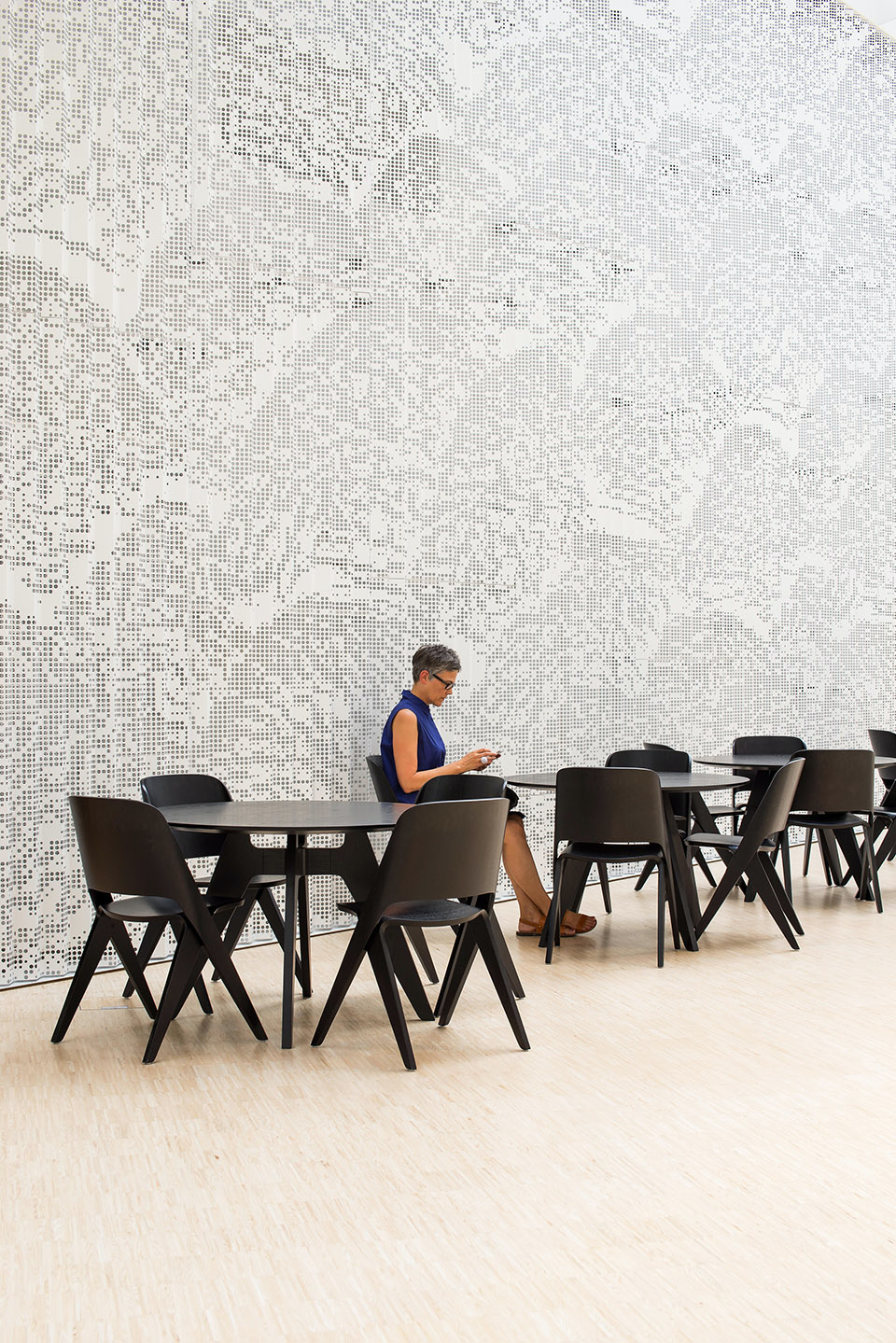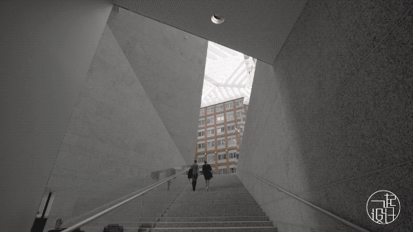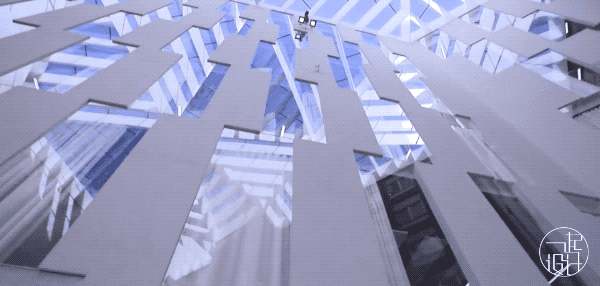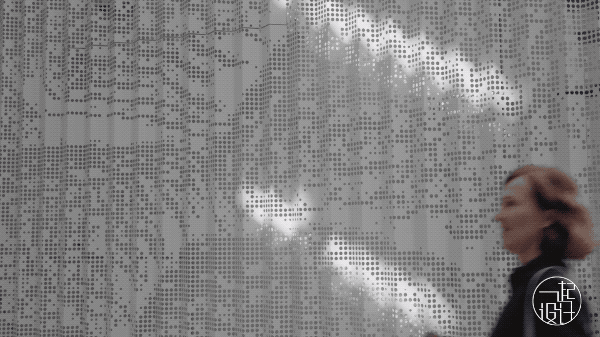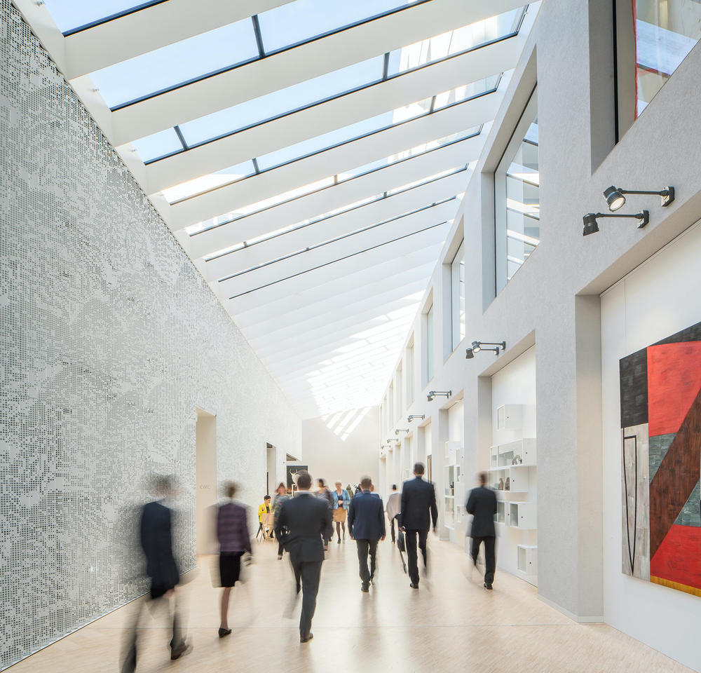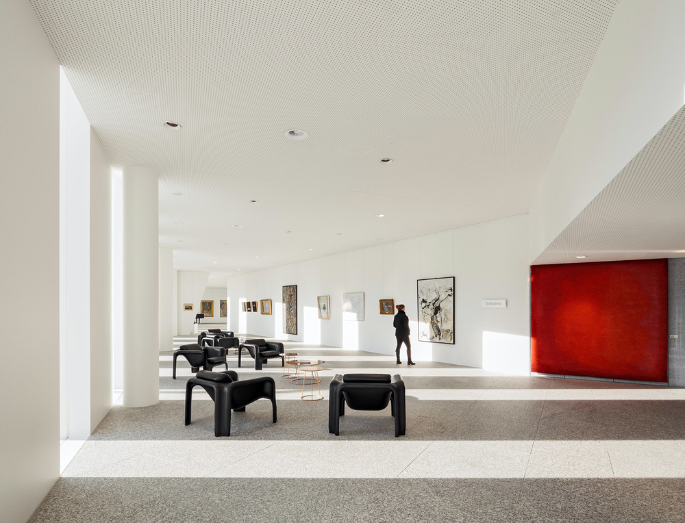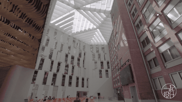 明亮的空间氛围、极为巨大的空间尺度、各种充艺术感的折线以及墙面的材质肌理,无一不在透露出独特的美感 ▼石材、金属穿孔板、玻璃、红砖……这些各自都非常独特的材质同时出现在一个画面中,却分外和谐而美好 ▼整栋大楼最吸睛的地方肯定就是下面这个采用了独特钢结构的玻璃屋顶 ▼得益于它,整个室内空间不仅氛围明亮,而且巨大的体量显得尤其轻盈,让人在室内都能感受到如同在室外行走般的通畅 ▼而室内的建筑内立面延续了外立面的开窗逻辑,有一种独特的秩序美感,玻璃窗户倒映出玻璃天窗的景象 ▼玻璃天窗有着独特的几何结构,仰视的景象还能看到各种丰富的内墙面肌理,彼此互相碰撞、消融 ▼玻璃屋顶以及内墙的纹理细节构成了一幅优美的图画 ▼在这里可以看到墙面采用了弯折起伏的穿孔板作为装饰,与其他室内空间形成虚实结合 ▼室内有着通往区域内部的长廊,设计得非常开放而且有吸引力,联通了各个功能空间 ▼