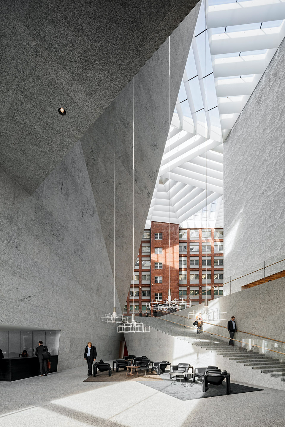 从入口处往上看,除了能够感受到一种宏伟的气势之外,还能够感受石材以及玻璃这两种截然不同的材质之间形成的对比 ▼室内设计延续了一样的设计语言,从踏入入口接待厅的那一刻便会被眼前的景象所震惊 ▼