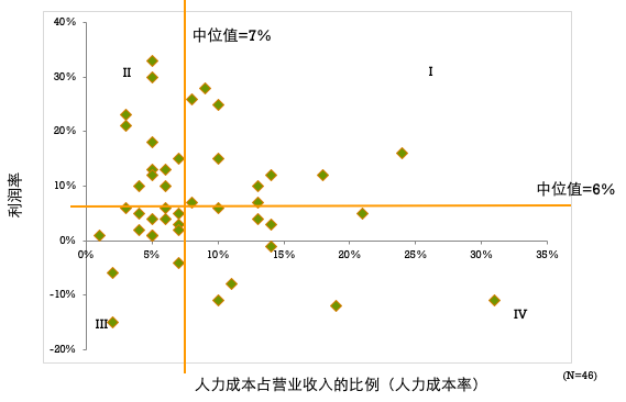【案例1】 消费品行业46家企业对比,人力成本率vs. 利润率。(每个点代表一家公司,横轴表示人力成本率,纵轴是利润率。数据仅为示例用。)以上图例从给员工的价值(人力成本率)和利润收益率两个角度,分别定义消费品行业46家公司都各自落在哪个象限,由此可以大致看出每家公司的支付策略。以下大致描述了四个象限分别的隐含意义。落在第一象限里表示公司成功地把成本转换成收益的创造,是“最佳奖酬境界”;在第二象限里的公司可能需要加强给员工的价值(适当增加人力成本在营业收入中的占比),才能更好吸引和保留人才;第三象限里的公司的支付能力受到利润率的制约,陷于很大的经营被动,当有重大调整;而第四象限里的公司在更高成本率的状况下创造的利润并不高,很可能是人员激励的方向出了问题,需要加强与战略的联结。