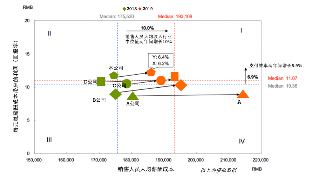 以下图示举例五家直接竞争的跨国医药在华运营公司,在过去两年中医药销售团队的人均支付水平和支付回报率的分析。 【图例:绿色形状表示各家公司在2018年的表现,橙色为2019年。灰色线表示各家公司在行业里位置的移动状况。数据仅为示例用。】