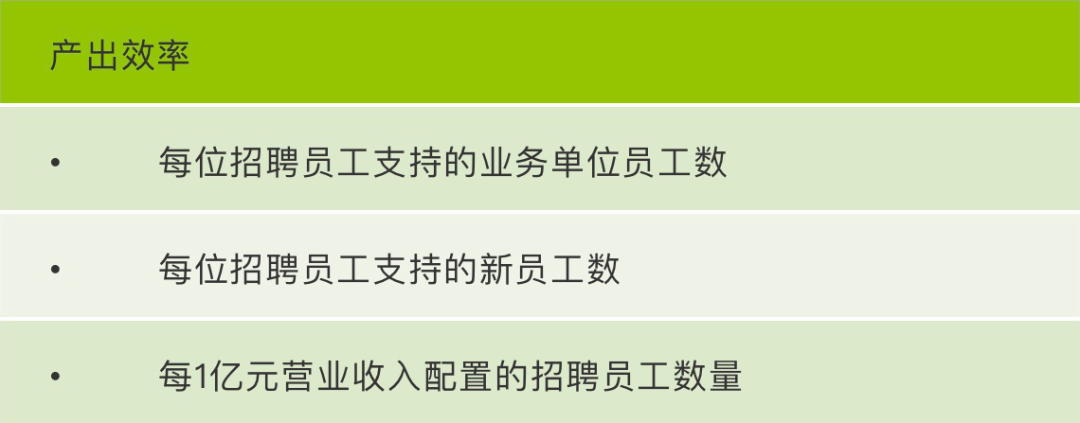 产出效率:往往和人员配置效率有关,即每位员工创造或者支持的收入或者产量规模。如果是利润中心,可以直接从创造的价值(如销售额或者产量)来衡量;如果是成本中心,则基于每位员工承担的成本支出规模、工作量规模,或支持的员工数或者收入规模衡量,例如IT共享中心会以每月人均处理的询问量来计算产出效率,招聘流程会以每位员工支持的招聘量或者支持的员工数来衡量。以下是招聘流程产出效率的衡量角度举例: