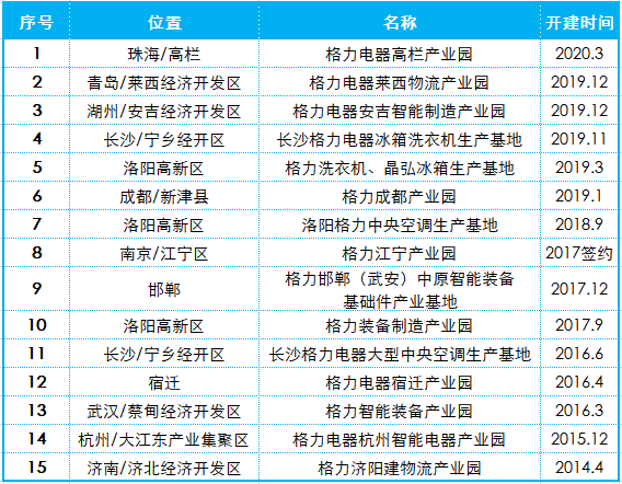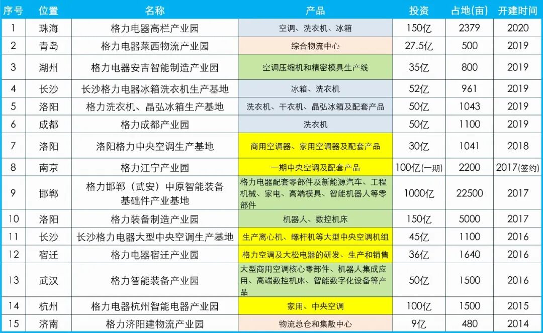 过去一年,至少有5家格力产业园落地;今年疫情趋于稳定后,格力高端智能电器产业园在珠海开工。5月,董小姐现身江西赣州,格力再签制造基地。粗略统计,自2014年以来格力投建15座产业园,平均每亩投资强度超400万元。用地规模一般500亩起,动辄千亩、甚至上万亩。董小姐的产业版图,比你以为的更大、更豪横。选址960整理了2014年至今,格力官宣投资、占地等详细信息的15座产业园(或生产基地)。或许与格力近年来产业园落地的实际数量略有出入,但对于理清格力的产业动向或可提供一点思考。总体来看,15座格力产业园(或生产基地)总占地面积近4.4万亩,平均每个产业园占地3000亩。从拿地风格看,格力产业园习惯性拿地在1000亩上下,少则500亩起步,体量最大者超2万亩,其中面积在2000亩以上的巨无霸式产业园有4座。其次,品种丰富。依据功能及主打产品可将格力产业园划分为4类,分别是物流园、空调园、冰箱洗衣机园,以及机器人模具配件园。从投资规模看,格力产业园投资一般10亿打底,30~50亿才是常规操作,百亿投资也并不少见。15座产业园总投资逼近2000亿元,平均投资强度达430万元/亩。格力以空调起家。格力电器2019年报显示,格力电器2019年营业收入达1981亿元,空调业务收入占据70%。截至2019年底,格力在全球拥有14大生产基地,分别坐落于珠海、重庆、合肥、郑州、武汉、石家庄、芜湖、长沙、杭州、洛阳、南京、成都以及巴西、巴基斯坦,这14大生产基地基本以空调生产为主。2012年前后,格力已在全球布局9大生产基地,包括珠海、重庆、合肥、郑州、武汉、芜湖、石家庄、巴西、巴基斯坦。自2014年起,格力先后在杭州、宿迁、长沙、南京、洛阳等落地5家生产基地,专门用于家用空调、中央空调生产制造。截至2018年9月(开工时间)格力已基本完成空调园布局,至此格力空调形成由南方扩散至中原的产地格局。在空调领域,格力牢牢稳坐国内销量头把交椅。然而从拳头产品走出来,综合实力不如人意,冰箱不如海尔,生活电器拼不过美的,结果是2019年格力营收在家电行业排名中位列第三,略输美的、海尔。