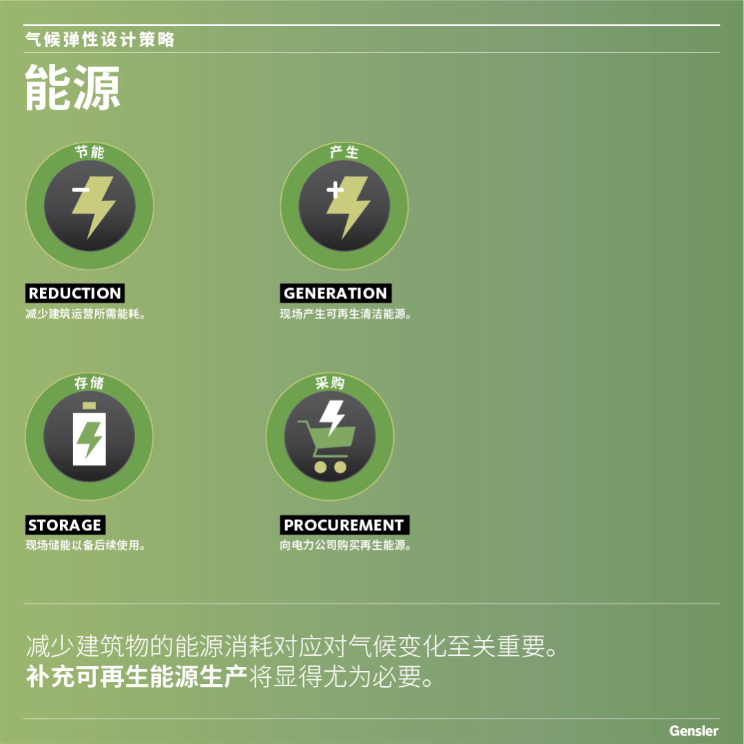 "All things live in harmony and grow with nourishments." Chinese culture values harmony between man and nature and respects nature. At the opening ceremony of the 2015 Paris Climate Conference, Xi Jinping announced that China pledges to peak CO2 emissions by around 2030, reducing CO2 per unit of GDP by 60-65% over the 2005 level. Going forward, ecological endeavors will feature prominently in China's 13th Five-Year Plan. China will work hard to implement the vision of innovative, coordinated, green, open and inclusive development. In the last five years few years, China's efforts and achievements are evident. China's green buildings have developed rapidly in China, which is already the largest market for LEED building certification outside the United States, with more than 1,000 LEED certified buildings per year.仅在2019年,Gensler完成了全球7,000多个项目,总面积超过1亿平方米,是全球排名第一大的建筑设计公司。Gensler选在4.22地球日这一天全球发布《设计影响力》报告,旨在通过位于全球50个办公室的6000多位设计师的共同努力,通过设计的力量,积极应对气候危机Gensler始终遵循弹性设计策略,为适应不断变化的世界。《设计影响力》报告中将重点阐述回应气候的弹性设计的五项策略:再利用现有建筑、空间以及材料;通过设计规模、朝向、体量、开窗方式等优化建筑性能;使用可回收或低碳材料降低产品生产及运输中产生的能源消耗;优化建筑物中的水处理以及水排放措施;充分利用可再生能源降低建筑物的能源消耗。以上这些战略可归为两大框架:减少石化燃料的消耗,以及重新审视已建成环境。STRATEGIES FOR CLIMATE RESILIENCEGensler has always supported design strategies to adapt to a changing world. The Impact by Design report highlights five strategies for climate-responsive, promoting climate resilience, which falls into two categories: (1) reducing consumption of fossil fuels and (2) rethinking the built environment to live gracefully with climate change. They are: