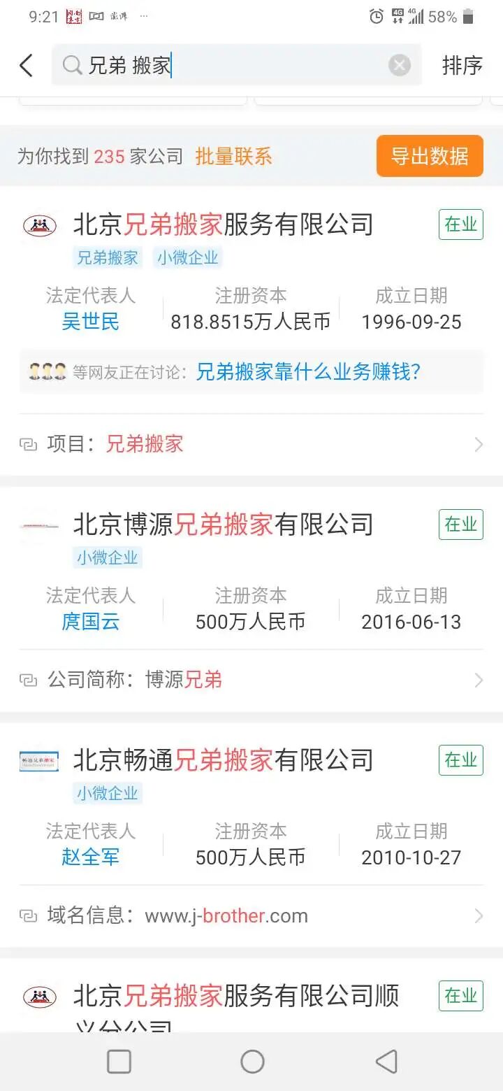 7月28日,新京报记者在天眼查搜索“兄弟搬家”发现,仅北京地区就有200多条搜索结果,多为名称中带有“兄弟”二字的搬家公司。