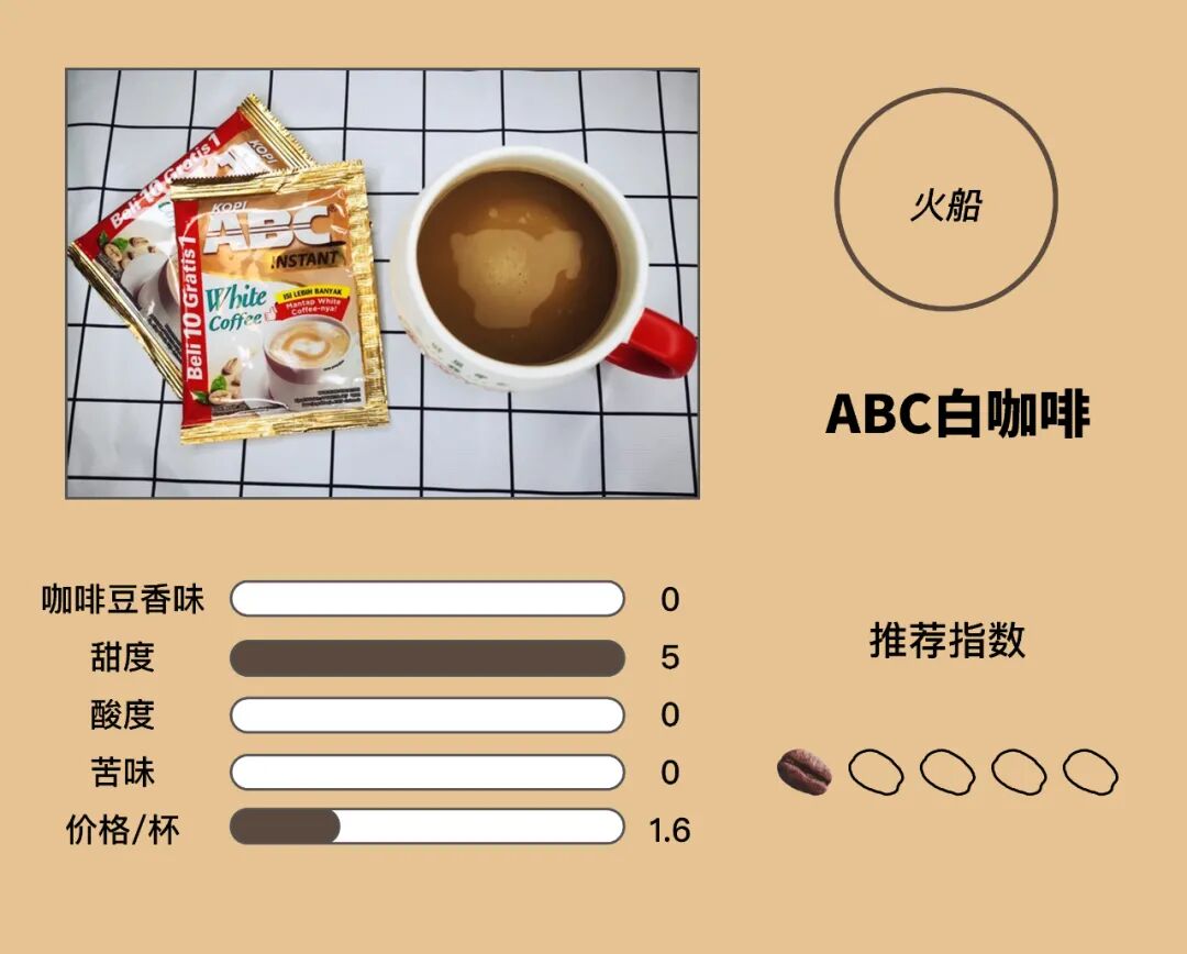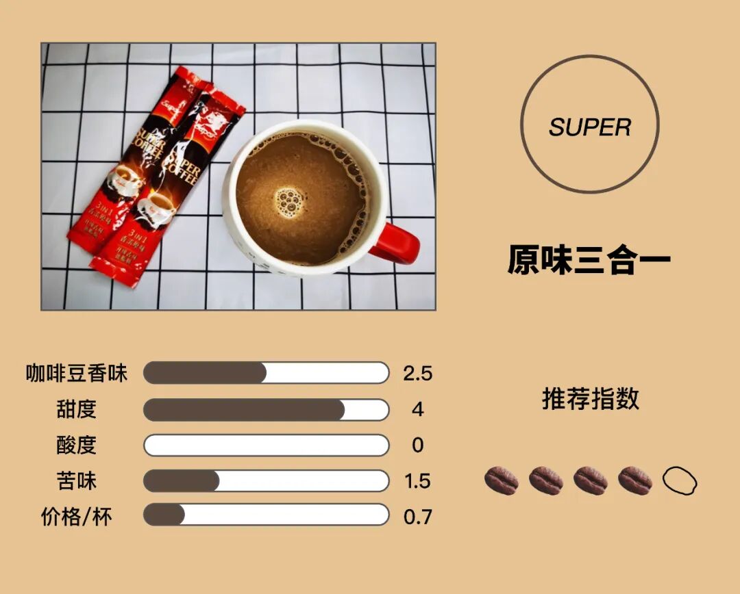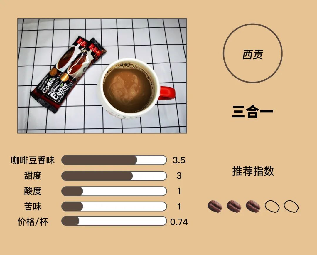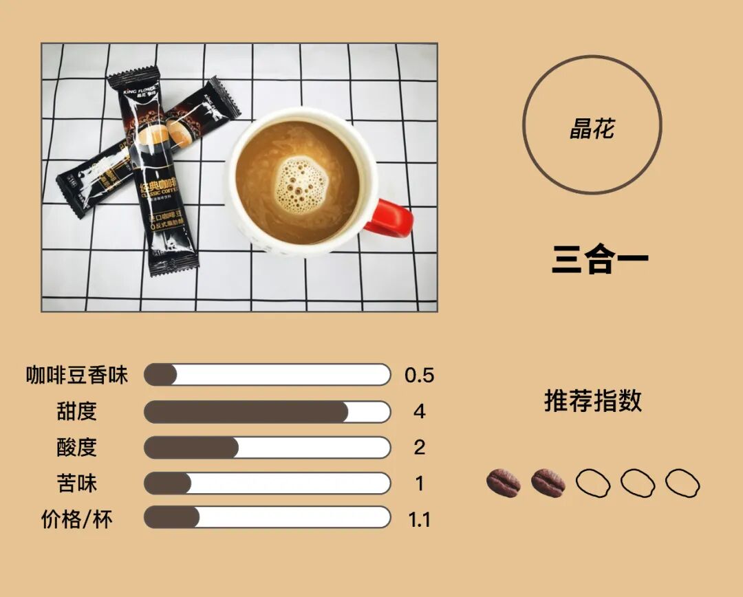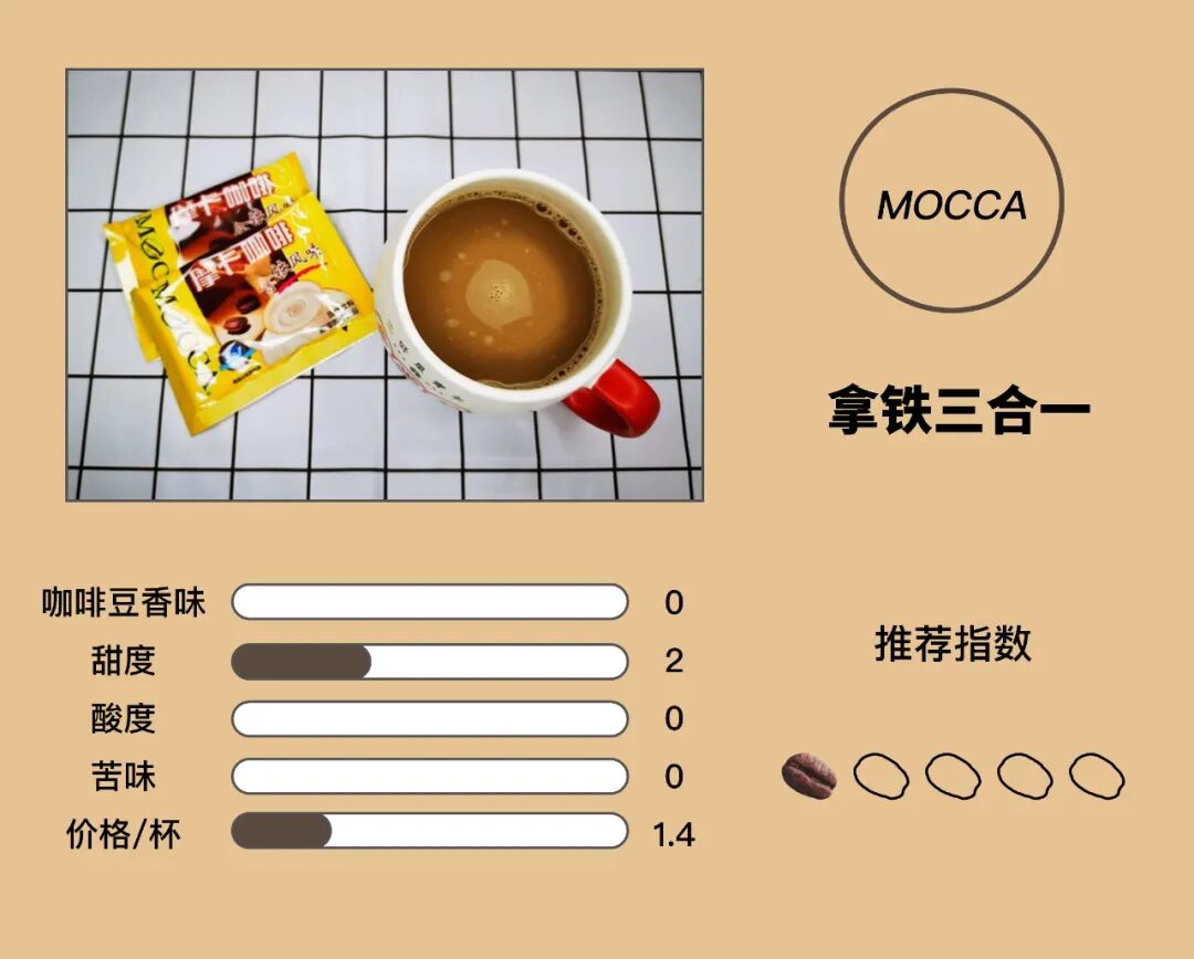 评价:这是一杯标准的速溶咖啡,很甜,没有明显咖啡味。每杯1.4元的价格也比较适中,可以及格。