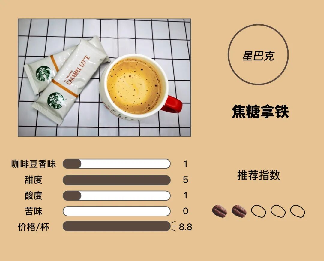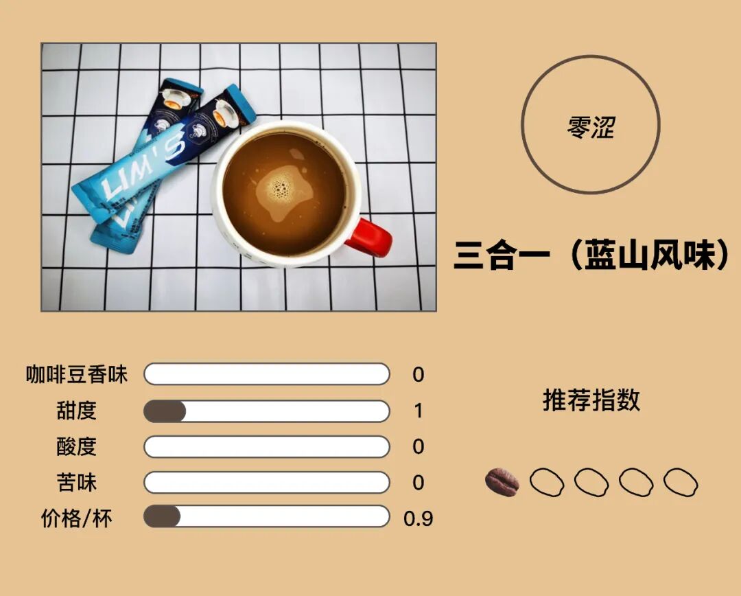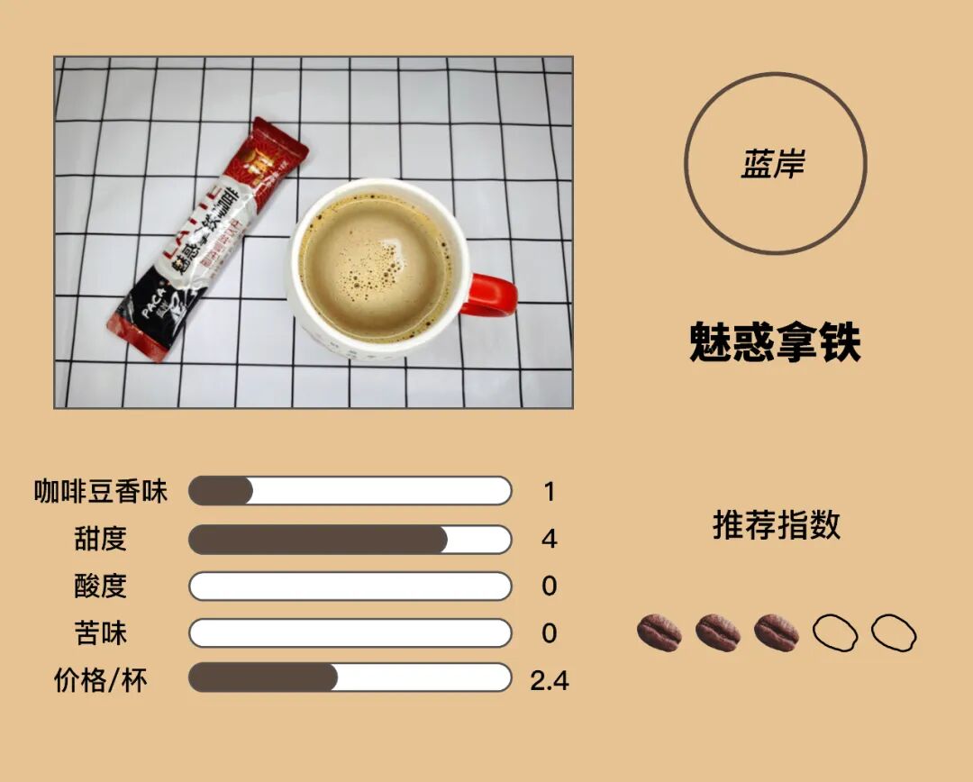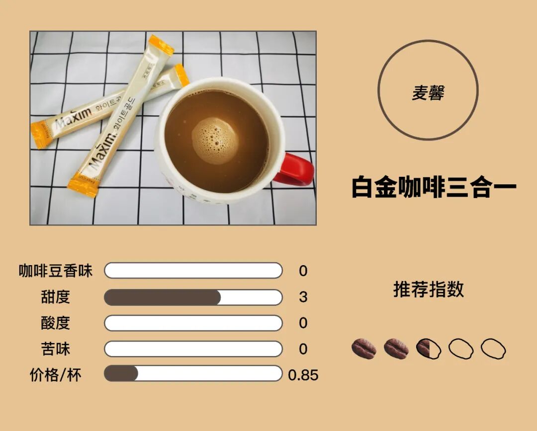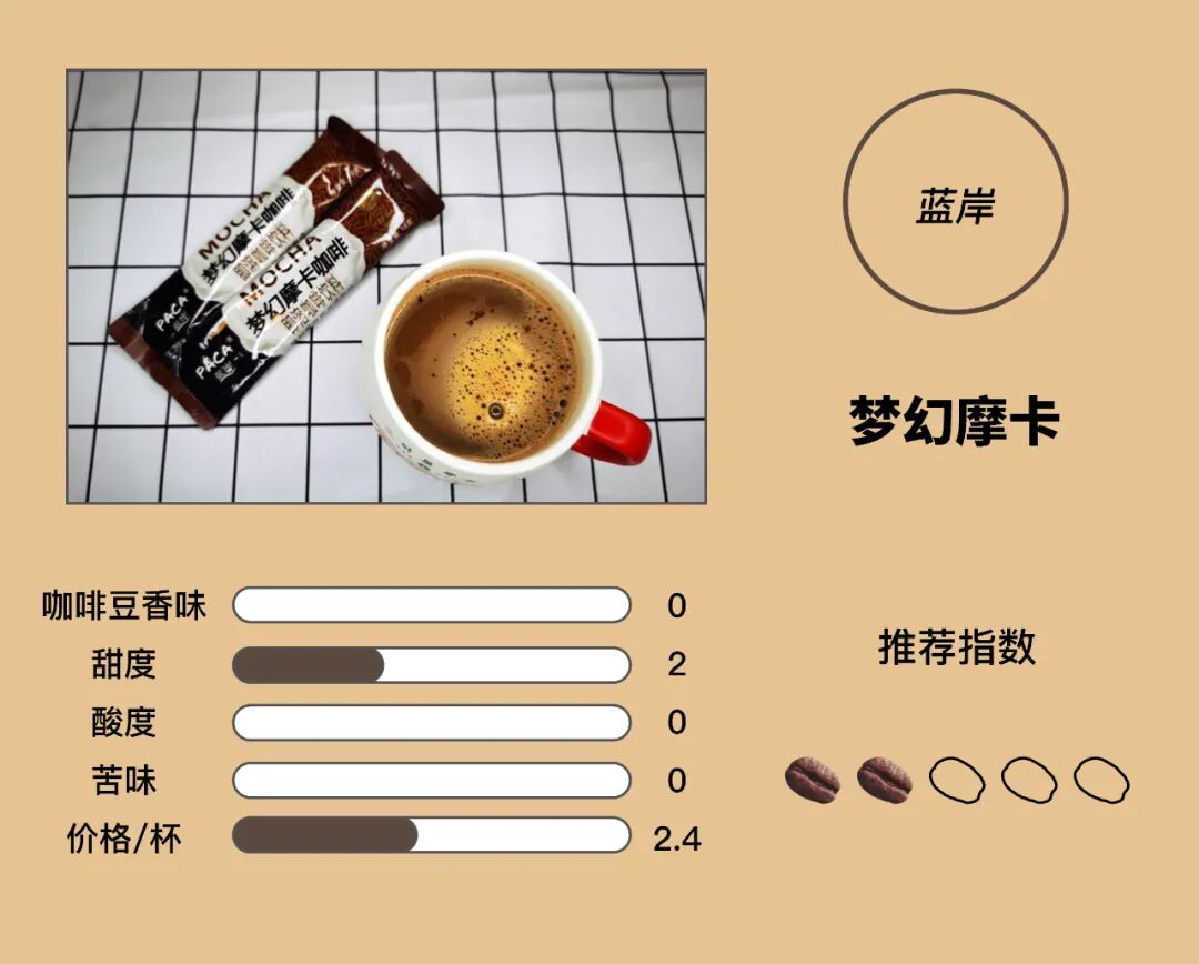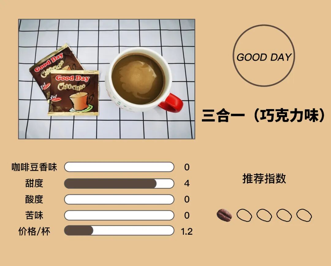 评价:这也是一款意见分歧明显的咖啡。有三位测评员表示只有巧克力味,没有咖啡香,而且过于甜。给1分,不推荐!