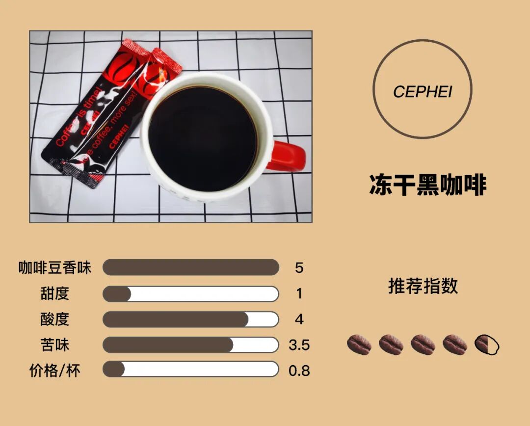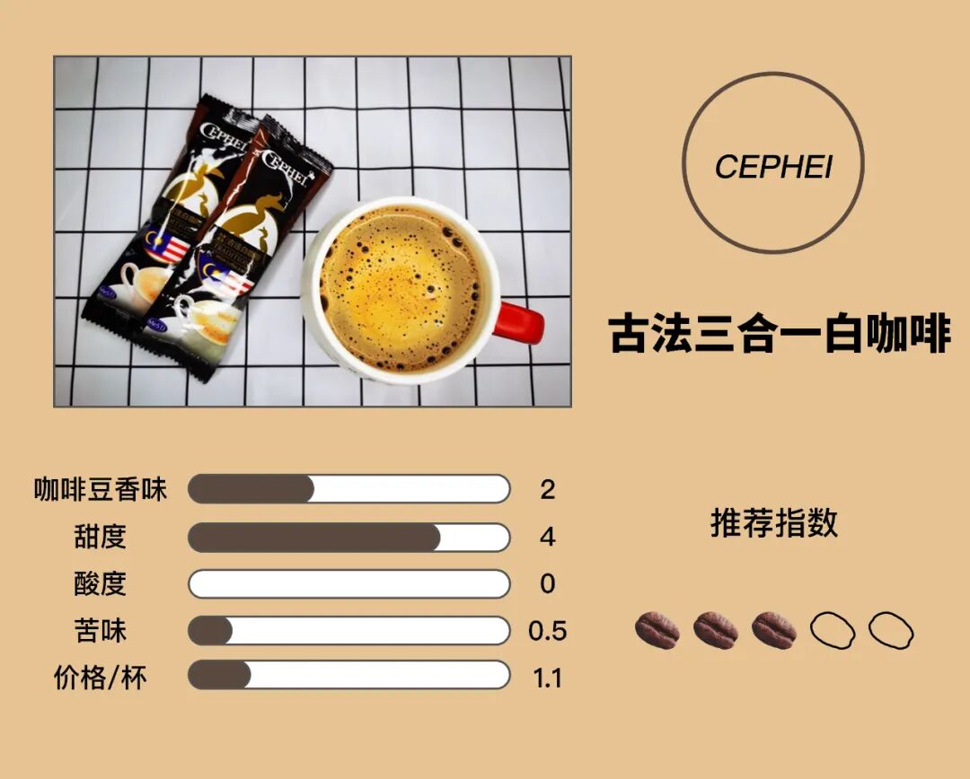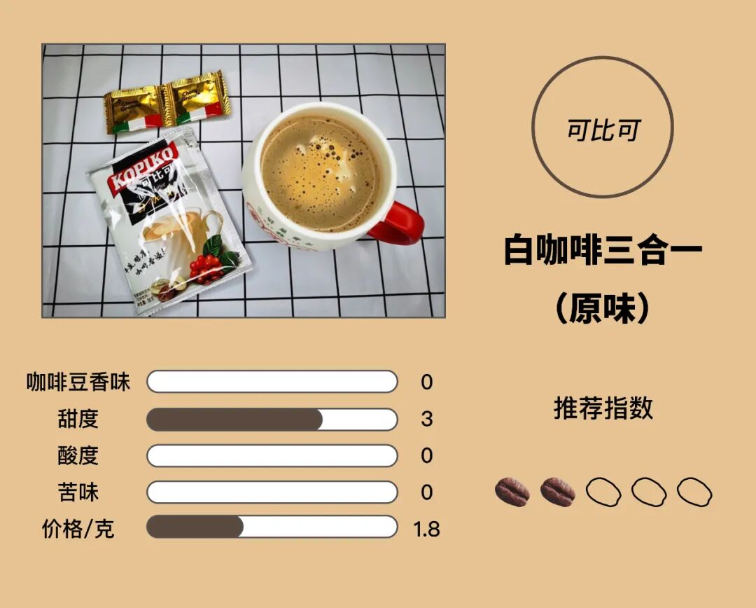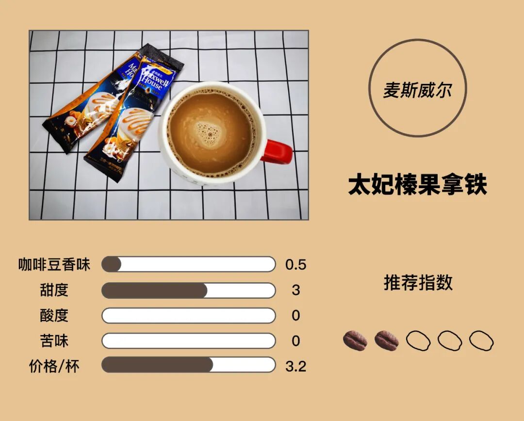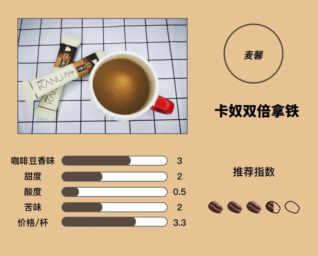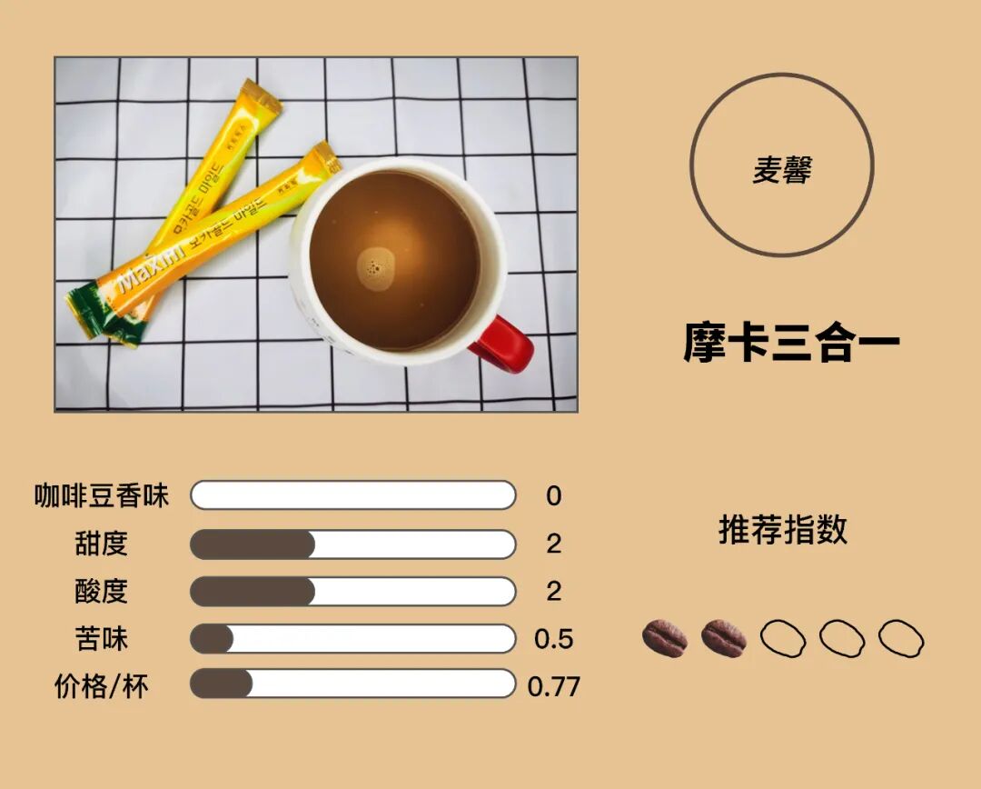 评价:这也是一款意见分歧明显的咖啡。有三位测评员表示只有巧克力味,没有咖啡香,而且过于甜。给1分,不推荐!