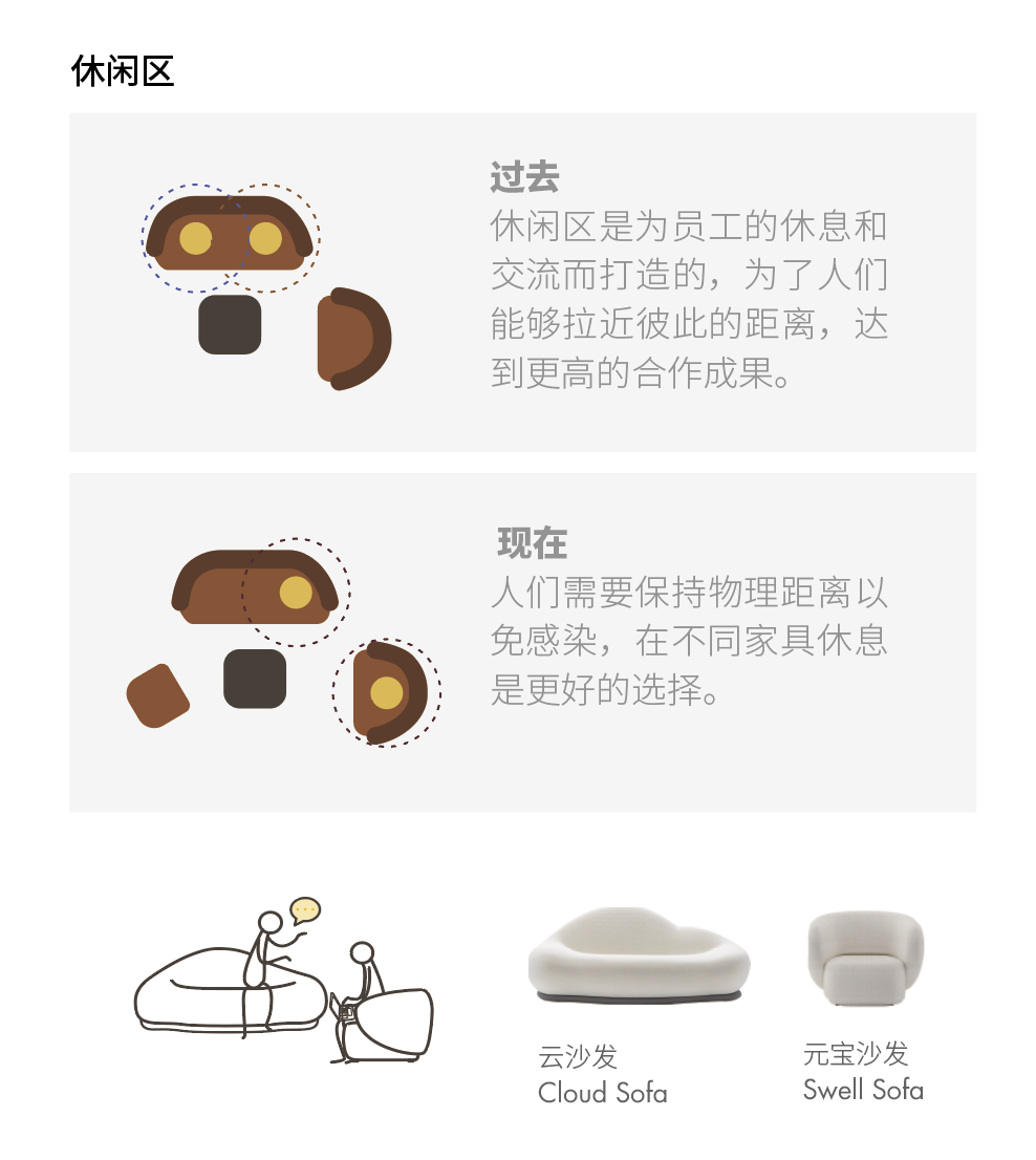 当代办公空间不断分化出新的功能场所来迎合各种办公需求——想要封闭的沟通环境可以去小型会议室,放松交流可以去茶水间,缺乏灵感时可以去休闲区,想要进行团队的信息传递则可以去培训空间……然而,在后疫情时代,这些通过近距离沟通创造强大价值的公共场所都变得有些敏感。