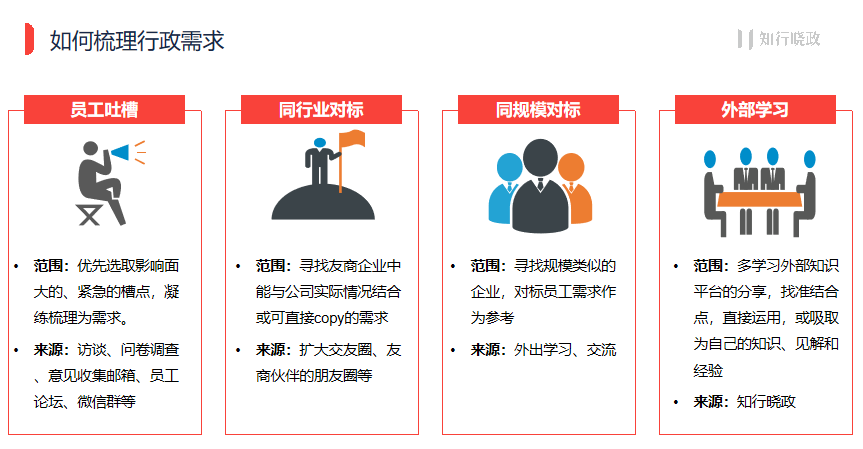这里我们首先要明白行政管理需求的对象是老板,我们需要对老板展示工作成果,并争取更多的资源调配;引导体验的对象是员工,让他们看到行政做了什么工作,鼓励他们体验并给出反馈,从而改进。