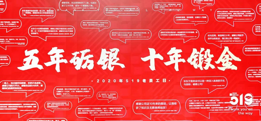 从2016年5月19日开始,每一年的这一天都被定为京东集团的“519老员工日”。所谓:五年砺银,十年锻金!在京东成长10年的员工,放在行业里的任何一家公司,都能够像金子般发光!