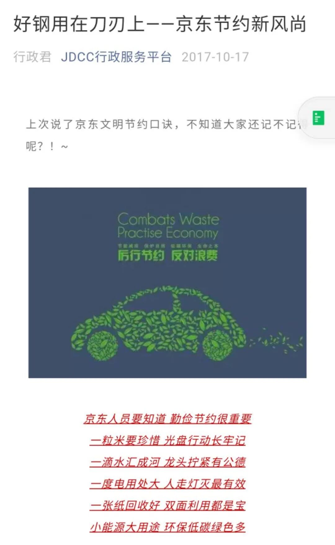 △京东为了帮助员工记忆,将节约准则编成了口诀,图源公众号JDCC行政服务平台