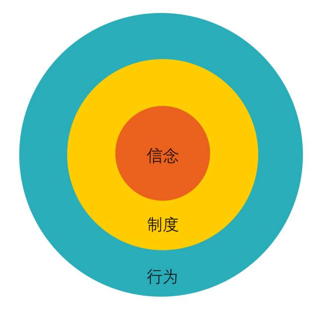 这就是企业文化的三个圈圈,信念,制度和行为,企业文化不该是奴役员工自由思想的工具,也不是强迫他人无条件服从的巧妙说辞,更不是党同伐异的核武器。不洗脑,不搞个人崇拜,不把人工具化,最大限度容纳多样性,鼓励大家用常识思考,这是关于人性的启蒙和点亮,去焕发人性最本质的光芒。