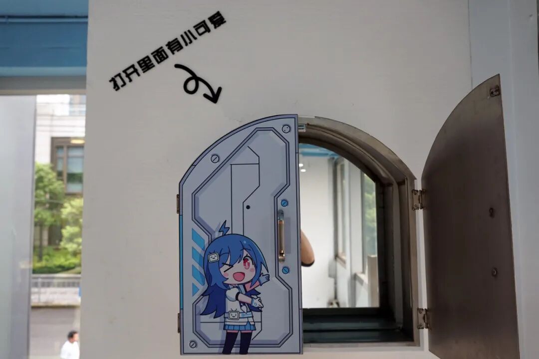 进入楼内,B站元素的运用就更加花样百出了。把2233娘变方坐在前台、印在门上来一个「大橘已定」、闪现上墙进行可爱暴击...