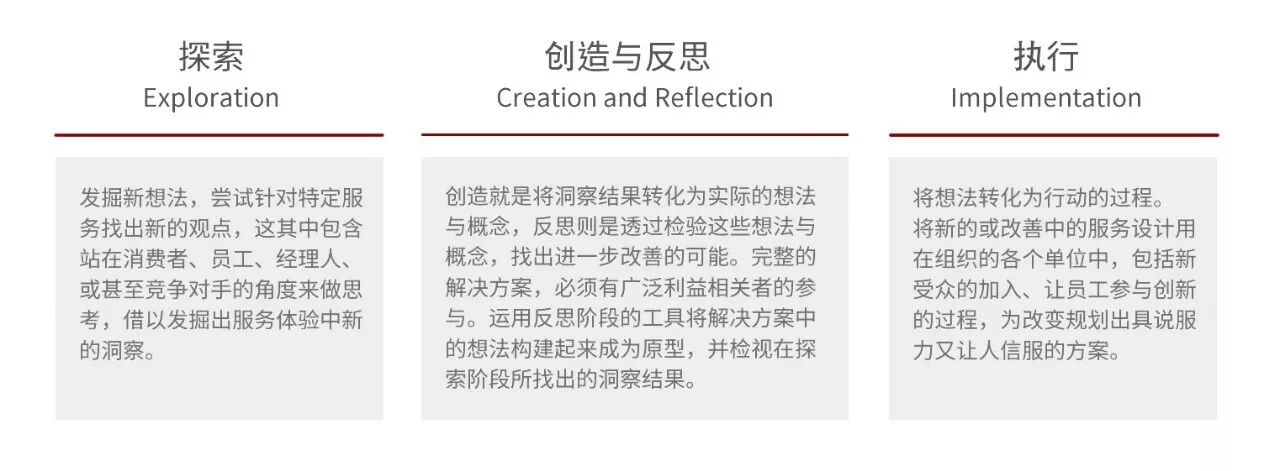 服务设计的专家们把这样的一个流程分为四个阶段:探索、创造、反思 和 执行。在服务设计的每一个阶段,都可能必须回到前一个步骤重新来过,甚至从头开始,你需要做的,就是从上一次过程中发现的错误中学习。
