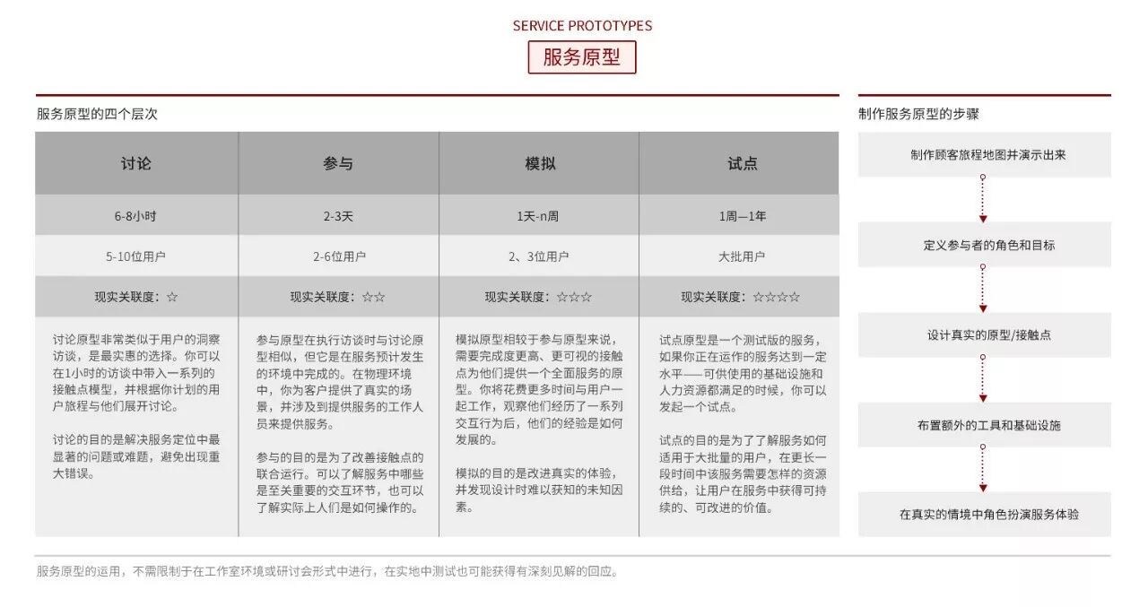 讨论原型 的成本最低,他与我们常做的用户访谈类似,一般是招募5-10个用户,在1个小时左右的访谈中带入一系列的接触点模型的方案,并根据你计划的用户旅程与他们展开讨论,以规避服务定位中可能出现的重大错误和显著难题。