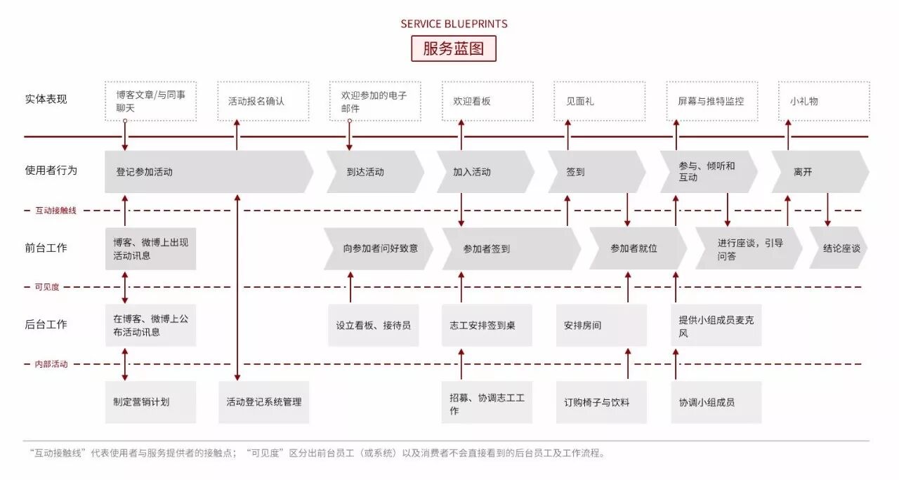 蓝图的最上方展示了服务的实体表现。一般在每一个接触点上方都能列出相关的服务实体表现。