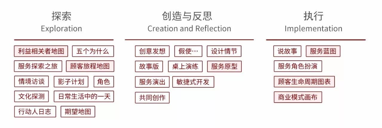 服务设计专家们列出了各种可帮助我们达成阶段性目标的方法与工具,可供选择参考: