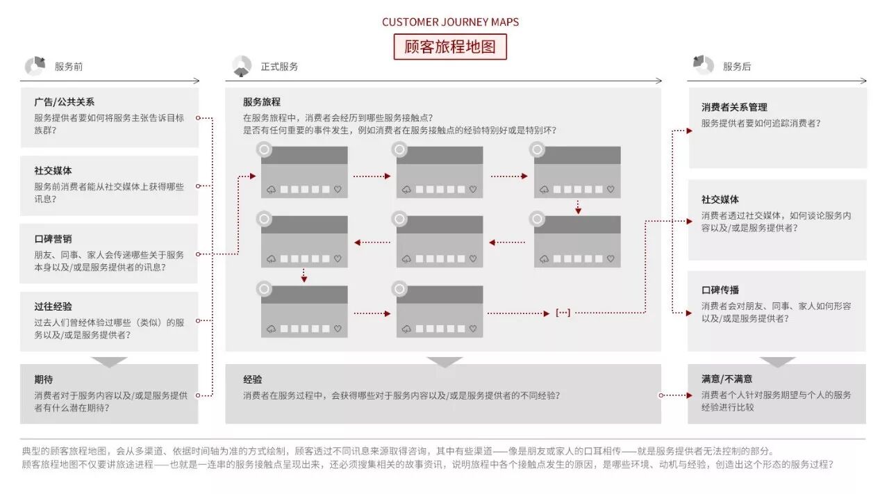 顾客旅程地图是服务设计中应用非常广泛的重要工具。它能够描述顾客在使用产品或服务时的主观反应和感受。尝试回答图中三个阶段中的不同的问题,能够帮助我们了解顾客从最初访问到目标达成之后的全过程,以及过程中每个阶段的痛点。