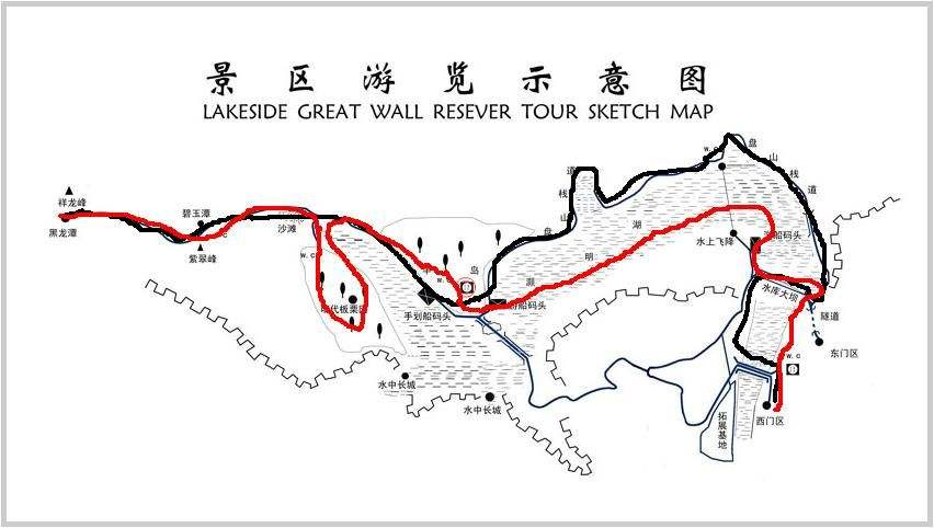 水长城有三绝,一绝长城盘旋于山脊,环绕在灏明湖畔;二绝湖水将三段长城自然断开,形成长城戏水、水没古城垣的奇特景观;三绝明朝传承的古栗园,古树盘根错节。