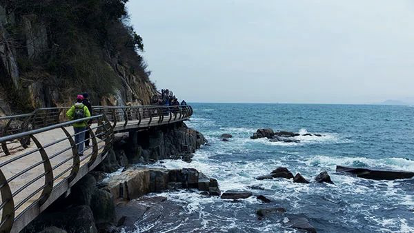 自然生态岸线段除了少数下到海边和上公路的台阶之外几乎都是很平坦的海滨栈道,全程轻松步行大约5、6个小时可以说是特别老少咸宜的徒步线路。