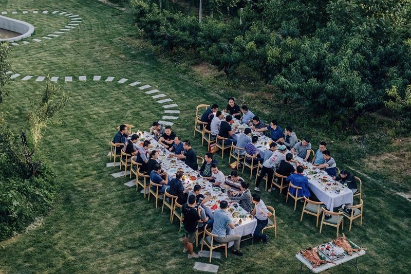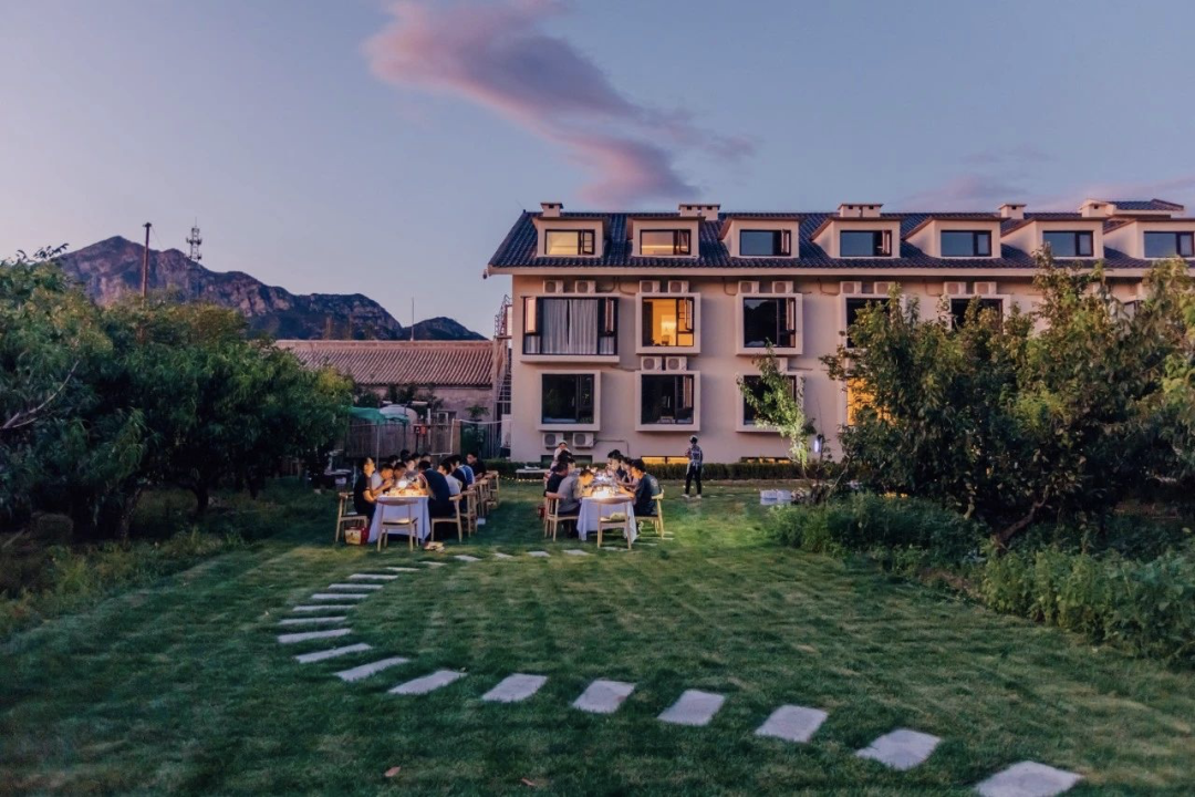 青瓦白墙的“青山依旧”,南面是一片广阔的草坪,果树林园三面环绕,夏日荫凉秋天果香,做起草坪晚宴来很有格调。