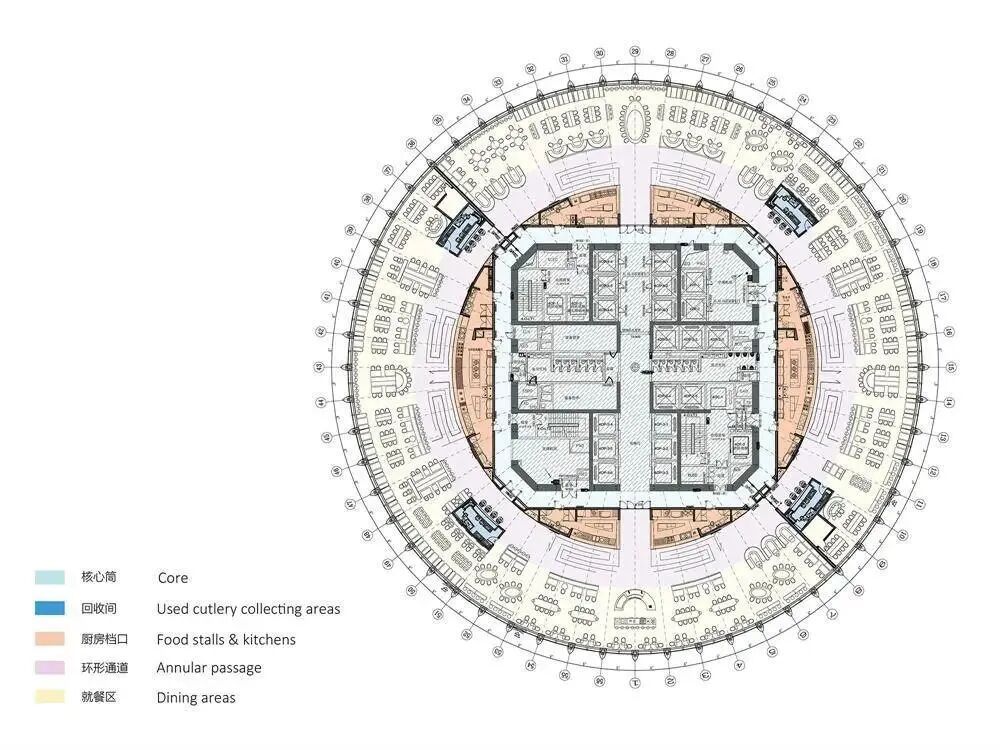 根据餐厅空间特点做环形、回形动线设计,可以增强空间流畅性及灵活性,为增加各种不同就餐形式的需求提供多元化的配置。如:环形内部设置餐线和档口,外部设置就餐区,使排队取餐人群同用餐人群互不干扰;回形外部设置档口,内部设置就餐区,即点即坐,有效分流。