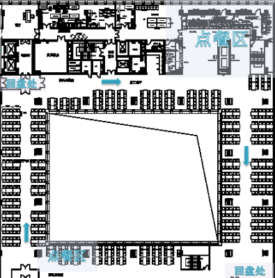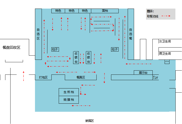 进场-点餐-结算-用餐-餐具回收-离场,是员工就餐的6个环节,要避免员工之间在不同环节产生交叉点或折返路线。
