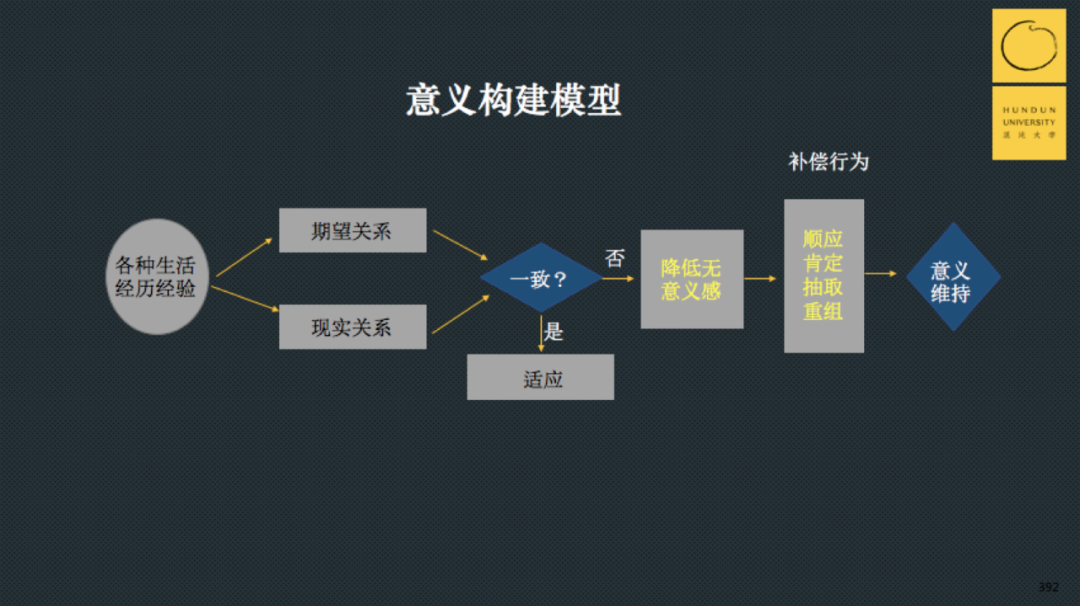 我们生活当中有各种各样的经历和经验,于是我们就建立了两种关系,一种关系是期望关系,另一种关系是现实关系,当我们的期望关系和现实关系一致时,我们的大脑就会适应,当两种关系不一致时,我们的无意义感会立即降低。现实和期望差距越大,生活会特别苦,人生会变得没有意义。