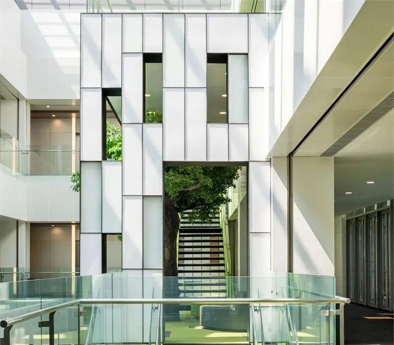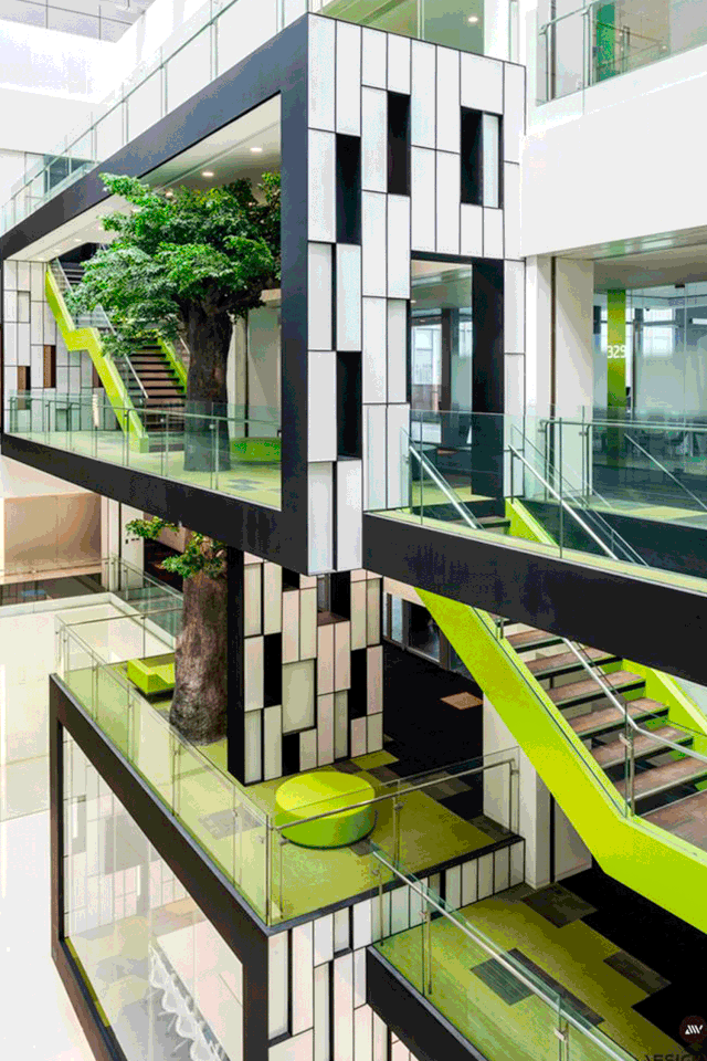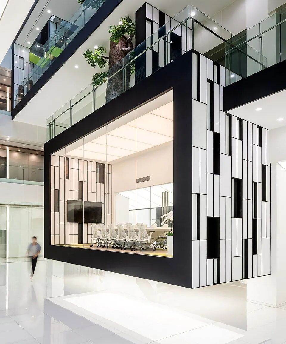 二期大楼临湖而建,在西侧入口处还采用了独特的“水帘洞”设计。为了实现创意的空间排列和游戏化的场景设计,为理性的员工提供给一个感性的空间,巨人办公楼有许多魔幻元素:绿树贯通楼层之间、楼梯穿插而过、空中悬浮的会议室、多个连接室内外的阳台...虚拟和现实交错的大胆设计带来了强烈的戏剧效果,形成了一个「造梦空间」。从园区的主入口进入二期大楼,天光跟着脚步走进室内,洁白宽敞的大堂中央嵌入一条10米长的灯带,仿佛一束白色的激光射出,一秒吸引住访客的视线。注重环境与员工之间的无形影响,是巨人网络打造办公环境的重要目标。他们认为,办公环境创造出或多或少变化的空间元素,能够影响或者改变员工的行为。因此,建筑和外部的界限被抹去,室内和室外巧妙地连接成了一个有机的整体。正如巨人网络联席CEO刘伟所说的:“员工工作时能跟自然有所接触,是很好的一个状态转换。”在空间内部,象牙白高光漆板、绿色的地毯、以及浅色的自然木纹相互交错,局部色彩的变化使空间被巧妙的划分,简洁、明亮、通透,富有节奏感。
