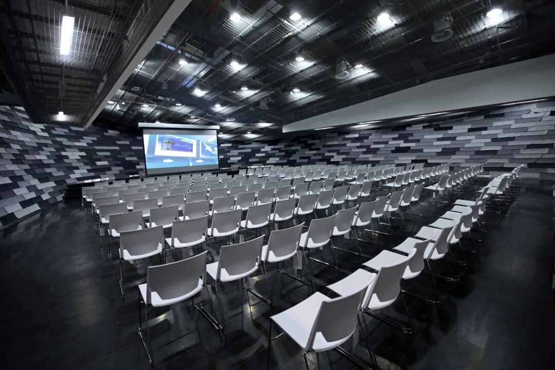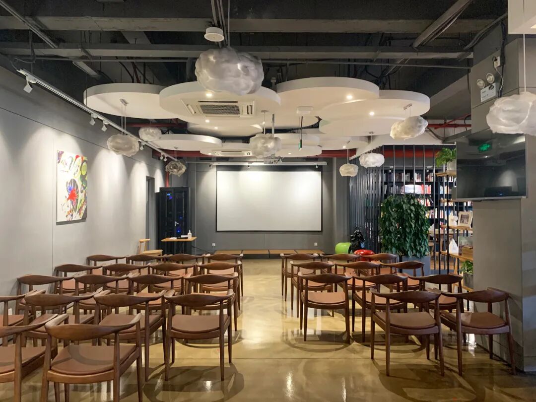 从一楼至顶层,一架超大楼梯形成了垂直交通,直截了当地插入空间、贯穿楼层,成为一道「天梯」。拾级而上的同时,员工可以欣赏整个中庭的风景。巨人网络对办公环境的内涵追求,不止停留在设计风格上,连灯光的选择也颇为考究。“好的光源,可以让人在长时间工作状态下不容易产生疲劳感。”办公楼中央的天井,透过四层楼将自然光引入进来,让空间豁然开朗。作为漫射光线,自然光本身带有的些微淡蓝色柔化了整个空间,结合大面积的挑高,给员工带来一种独特的沉浸感。今天的办公室设计,需要考虑的不单是功能的满足。如何创造有趣的空间而不会“荒于嬉”,同时保持高效而不焦虑,满足精神层面的需求成为巨人网络的办公空间标准。在二期大楼中庭,有一个外跨出空中、悬浮着的会议室,仿佛空中楼阁十分具有科技感。会议室里设有休闲家具供人交流放松。巧妙的立面构成,使每个角度都宛如取景框内的画。这样的设计既打造了一个视觉的焦点,也令室外硬朗的建筑变得柔软有趣。悬置设计,并不是为了炫酷,而是基于对员工工作环境的分析得来的:巨人网络主要由一群平均年龄不超过30岁的“码农”组成,企业希望让程序员们从大量繁复的程序代码中抽离出来、得到放空和休息。在内部,“移步换景”,还能看到很多这样设计风格强烈的长廊。手绘的涂鸦墙面,既增添了空间活力,也能够通过鲜明的色彩调节员工状态、缓解压力。剧院式多功能大型会议室,场地宽阔适合多种类型的活动。并且全部铺上了双层纯羊毛隔音垫,以保证最佳的会议状态。