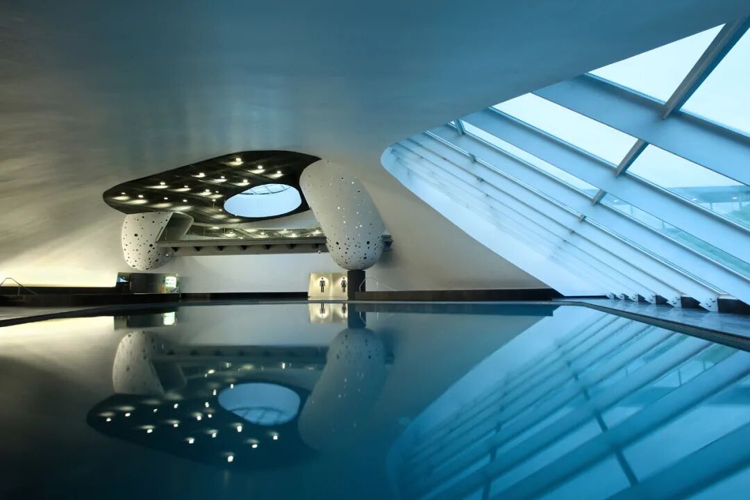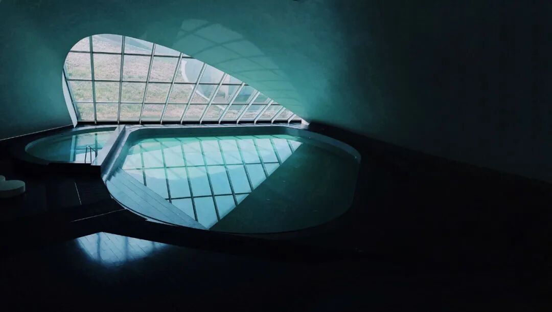 一楼的室内恒温游泳池,窗户是曲线型。乍看只有一半,但仔细观察就会发现,它与倒影合在一起是一个“心”形。这也是巨人给员工的一个惊喜。