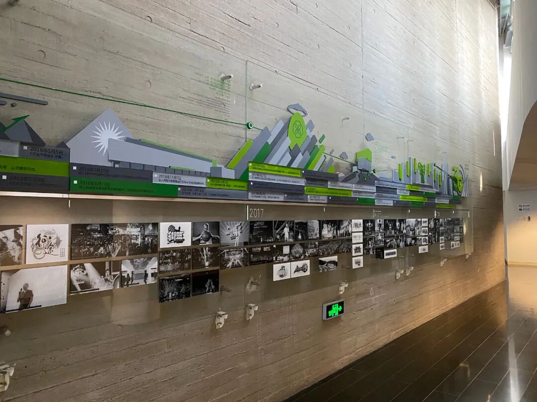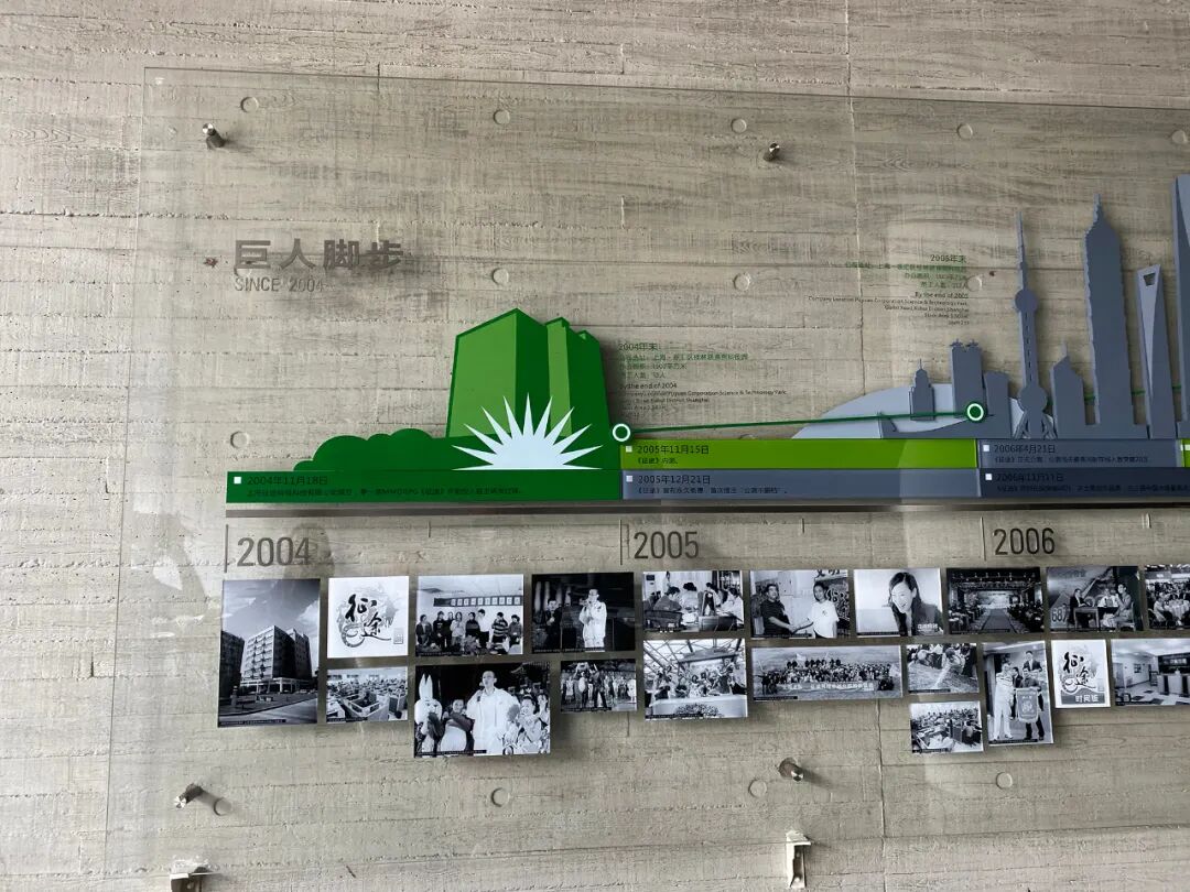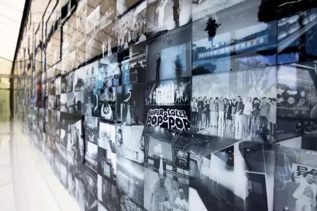 从企业创立至今,31年的发展进程都铭刻在这堵墙上。根据事件设计的图案装饰、与事件相关的照片,这种组合让发展进程变得一目了然。