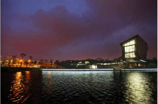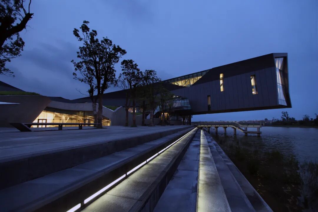 龙头内部,是一间「玻璃会议室」。站在全透明的玻璃地板上,脚下可见波光粼粼;极具现代感的几何墙面和线条的运用,能够把湖光景色倒映在空间内,让这间会议室充满了科技魔幻感。