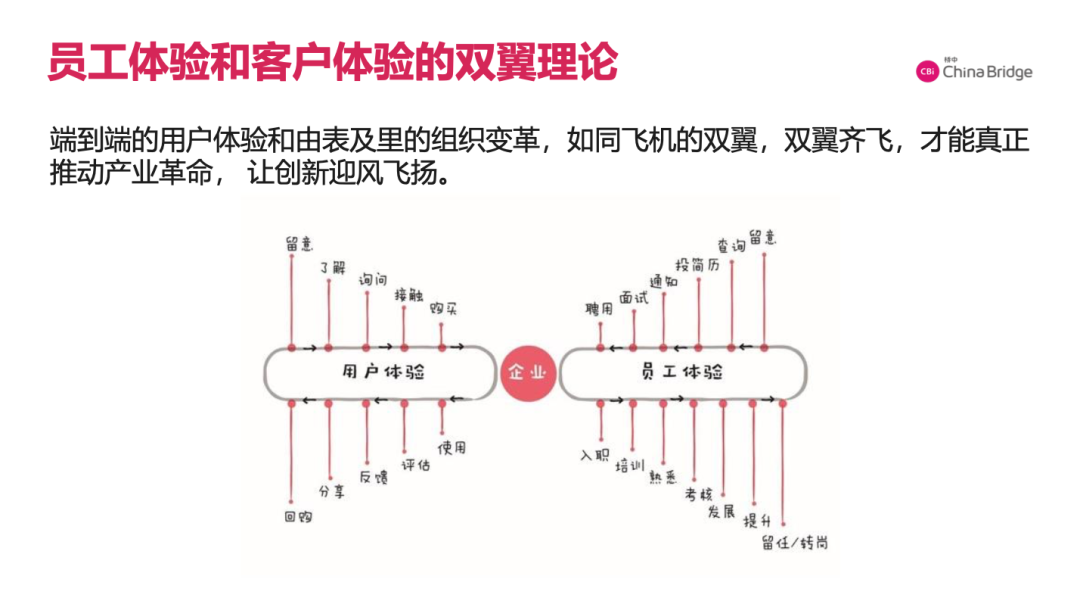 “我在去年提出员工体验和客户体验的双翼理论,企业就像一个引擎,用户体验和员工体验是左右双翼,只有双翼齐飞才能推动企业让它迎风飞翔。所以上图左边我们是端到端的用户体验,而右边是由表及里的组织变革,如果用旅程图来看,我们的客户从留意、了解、询问、接触、到购买,员工也是一样,从留意到查询、投简历、通知、面试、聘用,这是HR的回录,但行政也有它的回录,这个回录我们可以进一步地用方法论来拆。所以服务设计是战略设计,是拆成一步步,能够帮助你系统地全局化地去看体验,让体验上协同一致。”
