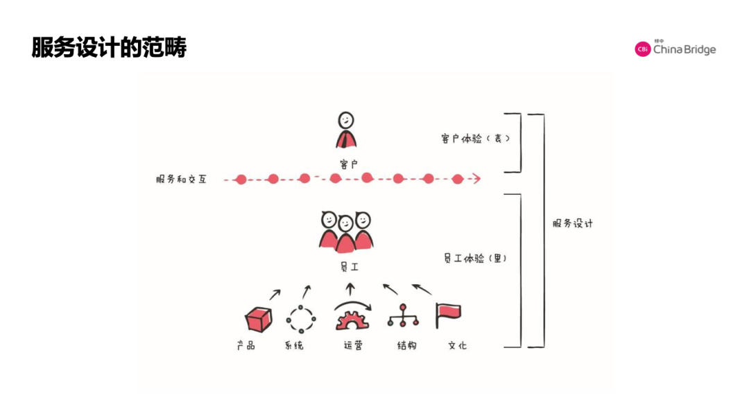 “服务设计的范畴包含了客户体验和员工体验,员工体验所支撑的是产品、系统、运营、结构和文化,而员工和客户之间这一站一站的,就是服务和交互。”