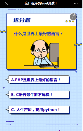 他们举办了一场技术嘉年华,在现场为程序员同学设计发型、跟着bgm跳舞、眼疾手快挑战反应力... 还有响应员工的爱好,来了一场云村虚拟直播、逆水寒在线捏脸、互联网剧本杀等潮流游戏。玩累了,还可以去撸猫!不仅有丰富的游戏,网易还举办了一系列技术知识活动,技术马拉松、全年技术颁奖盛典、系列技术知识分享... 让自家程序员获得身心双重满足!度厂用代码写下一行文字,表达对程序员们的感谢和祝福。除了这个,他们还准备了一个H5小游戏,「测测你是哪个level的程序员」。小知也玩了一次,结果很惊喜哦😏京东把今年的程序员节过成了Code Week,不仅有经典节目「三行代码show」、行业大牛分享,还有各式福利&嘉年华为公司程序员庆祝节日。最亮眼的是这一面主题墙。不仅吸引员工纷纷合照打卡,背面还可以填写心愿,一墙多用。各种游戏当然也不能少,下午茶、街机游戏、美甲按摩...齐上阵,力图让员工享受到顶级节日体验。