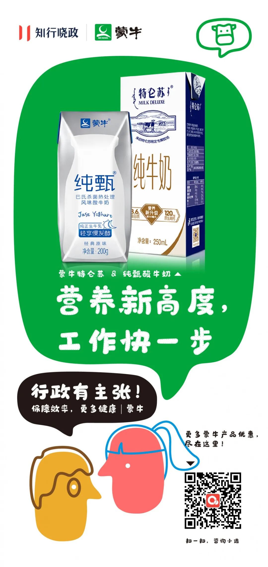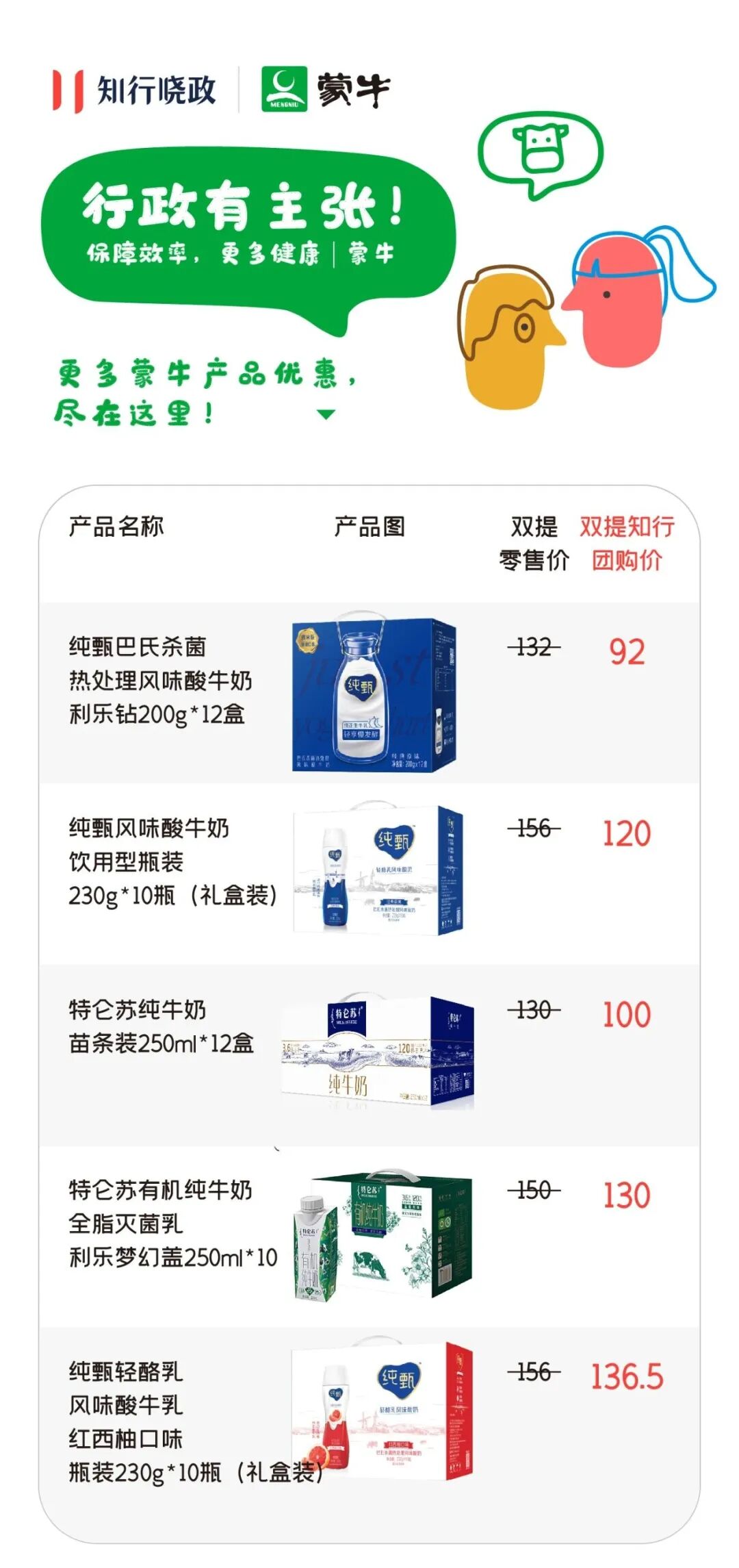 纯甄酸牛奶,甄选奶源、采用进口菌群自然慢发酵,保证健康品质,让员工享受酸奶本来的好味道!利乐钻包装更加方便储存、分发哦~除了以上两款,蒙牛还专为知行的行政伙伴们准备了更多优惠力度超级大的产品,充分满足大家的需求!