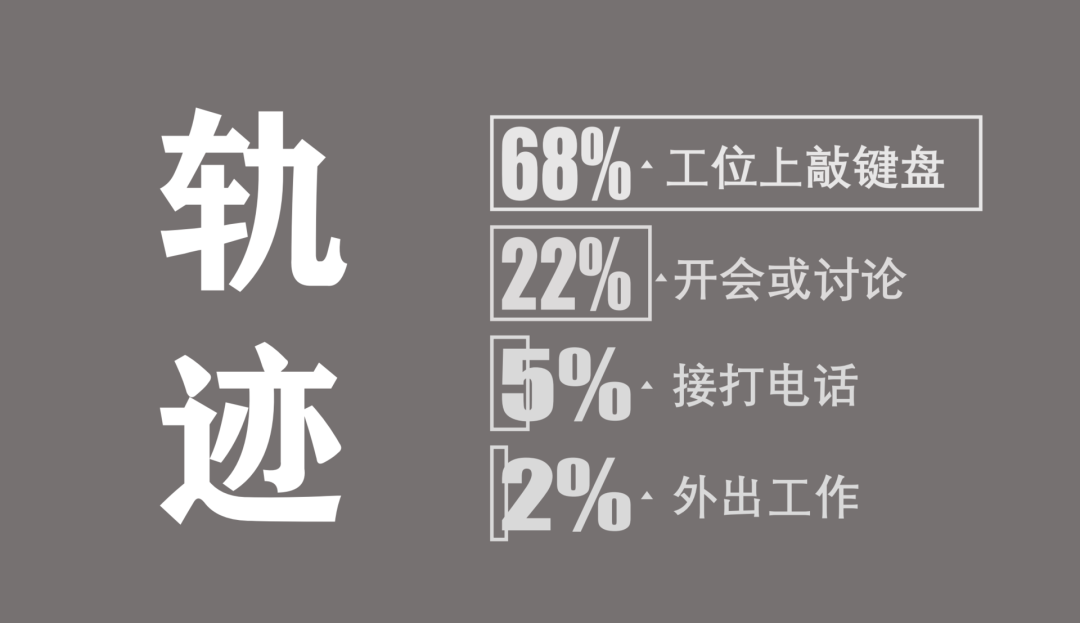 “关于员工需要什么样的工位,我们做了研究去描摹员工的行为轨迹发现:数据显示,68%的员工是在工位上一个人孤独的敲键盘,2成时间是开会或讨论,随时可能被别人抓走去讨论问题,非正式的讨论时间是远远高于正式会议、正式讨论的时间。另外5%的时间接打电话、2%会外出。”