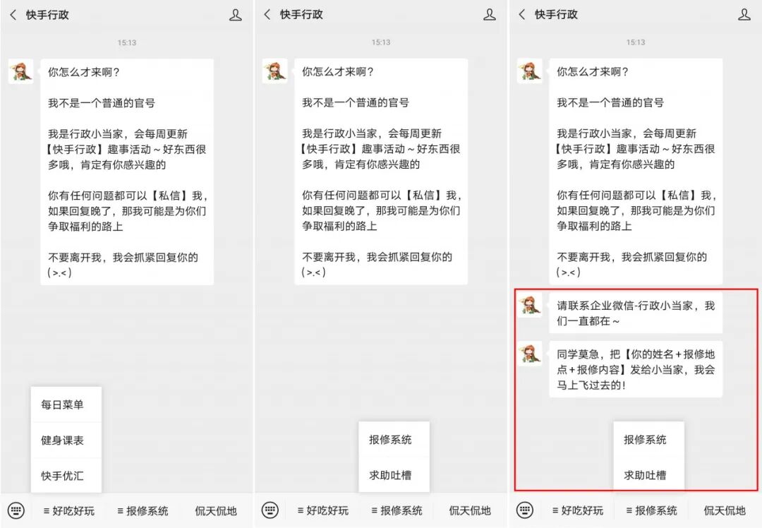 快手行政在基础信息查询服务菜单外,还把消息反馈通道单独列了出来,点击后有相应的文字信息回复,在最大程度上提高了员工的反馈体验。