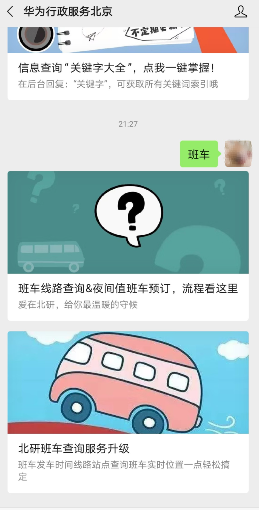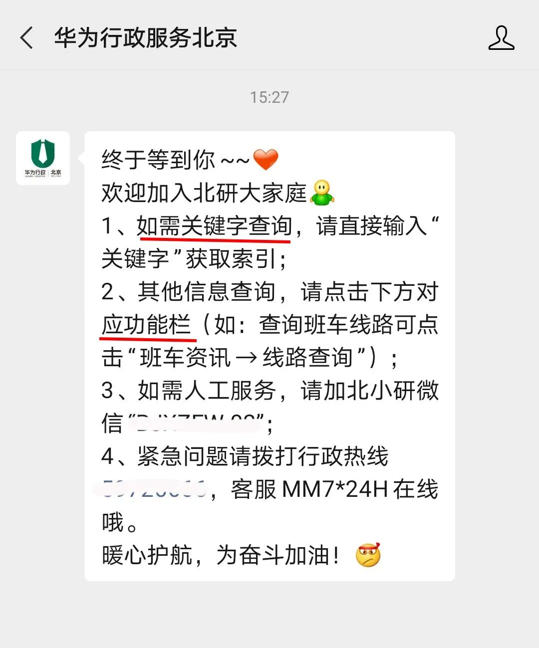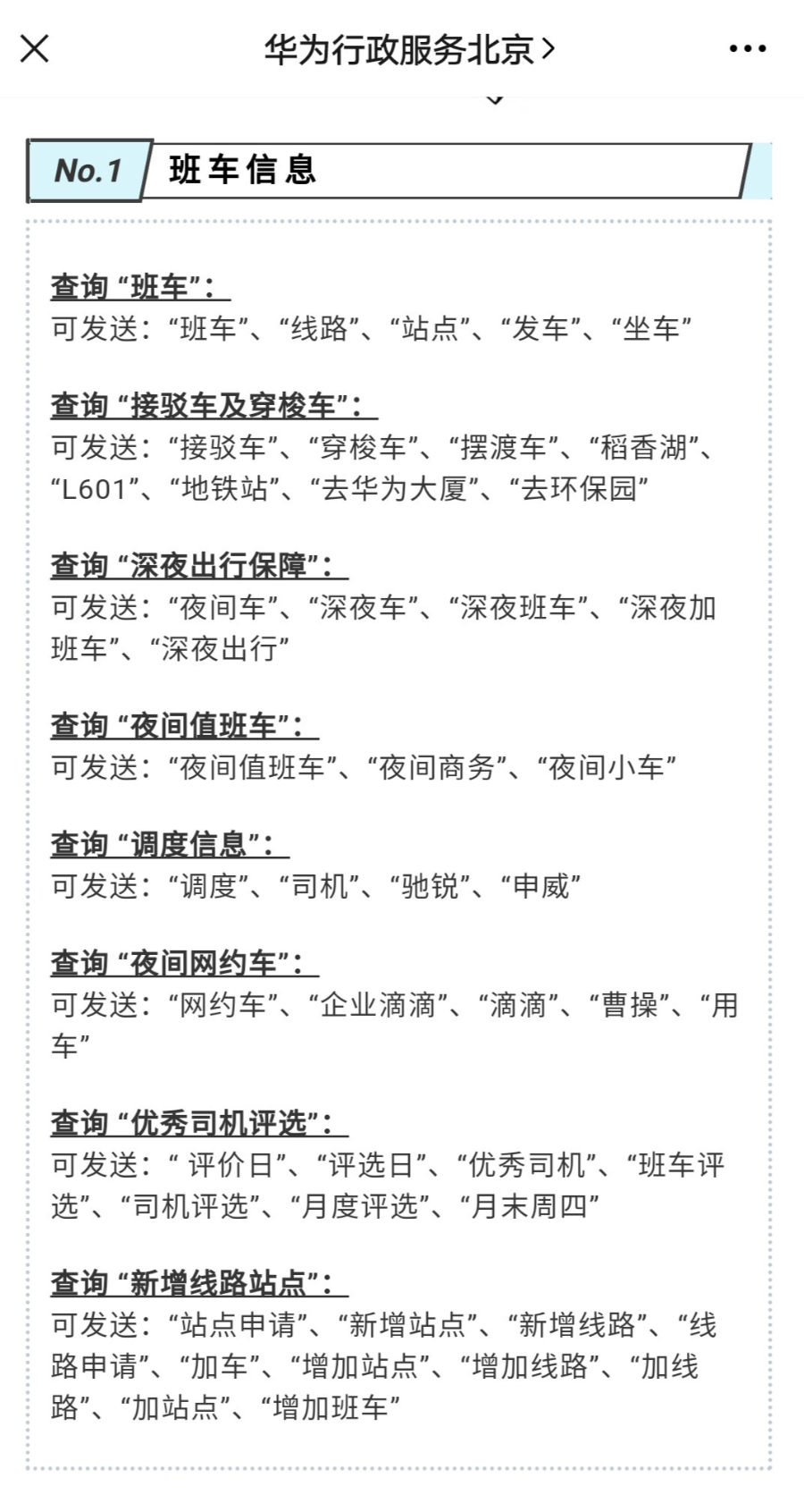 华为·北京的行政平台在被关注自动回复中添加了使用指引,引导员工通过关键字、菜单栏查询自己想要了解的基础信息。